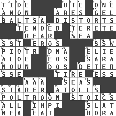 ACROSS 1. Event that recurs at intervals 5. Shoshoni 8. Single 11. At once, immediately (arch.) 12. Ancient Greek god of war 13. Set 14. Greek mezzo-soprano Agnes 17. What propaganda does 19. Looked after 21. Cylindrical with tapered ends 22. Bring up, as a child 23. Ocean 24. Fast jet (abbr.) 27. Greek god of love 29. Compass dir. 32. Peter (Polish) 34. Heredity factor (abbr.) 36. Writer Wiesel 37. _ vera 38. Greek goddess of the dawn 39. "Two Mules for Sister ____" 40. Part of speech 41. Two (Sp.) 42. Prevent from occurring 43. Compass dir. 44. Hoop that covers a wheel 46. Double-curved letter 47. Auto club (abbr.) 50. Oceans 52. A viewer who gazes fixedly 55. Ringlike coral islands and reefs 57. Characterized by complete cowardliness 59. Unemotional ones 62. 100% 63. Body of Kaffir warriors 64. Narrow board 65. Teachers' org. 66. Erode 67. Israeli folk dance DOWN 1. Bar bill 2. _ tizzy (2 wds.) 3. Dunce 4. Keyboard key 5. RI univ. 6. Trials 7. First name in cosmetics 8. Legendary monster 9. Remaining after all deductions 10. Otherwise 12. Say or write further 15. Scornful expression 16. The sixth month of the Jewish calendar 18. Mouth or opening 20. Worn away 24. Connects, as a bridge 25. Grain storage towers 26. Woman's close-fitting hat 28. Snout, nose 29. Chalkboard 30. Titles for men of rank and authority 31. Puts on (as clothing) 33. Nine, plus one 35. Aid 36. Compass dir. 42. Started a card game 45. Vintage cars 47. Tate display 48. Nest on high 49. Scent 51. Make a splashing sound 52. Connect, as a bridge 53. Lacquered or enameled metalware 54. Silent film actress Nazimova 55. Black tropical American cuckoo 56. Grain storage tower 58. Elect 60. 4-wheeled motor vehicle 61. R.R. building