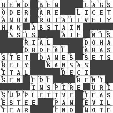 ACROSS 1. San ____ (Riviera town) 5. Benjamin's nick name 8. Fails to keep up a pace 12. River in Europe 13. "We ___ not amused" (Victoria) 14. It is permitted: Lat. 15. Small Philippine buffalo 16. Producing rotation 19. Opening into something insatiable 20. Refrain by choice 21. Fast planes 23. Had dinner 24. Mountains (abbr.) 27. Monetary unit of Yemen 30. Capital of the state of Qatar 31. Severe or trying experience 34. Caspian sea tributary 35. Proofreading order 38. Natives or inhabitants of Denmark 40. Arranges properly for use 41. Have confidence or faith in 42. Sunflower state 44. Slanted text style (abbr.) 45. Tenth: prefix 46. Elected rep. 47. Enemy 50. Monthly bill 53. Stimulate to action 57. RI univ. 59. Supplementary 63. Afternoon social gatherings 64. First name in cosmetics 65. Baking dish 66. Tending to cause great harm 67. Pull into pieces 68. Conclude 69. Brief written record DOWN 1. Wander 2. Ferber et al. 3. Catcalls? 4. Mouth or opening 5. Sharp remark 6. Greek god of love 7. Remaining after all deductions 8. 54 in ancient Rome 9. Adept person 10. Set 11. Filthy place 14. Actor's bit 17. Auto club (abbr.) 18. Teat (slang) 20. SW Saudi Arabia district 22. Trinitrotoluene 24. Greater amount 25. Not this but _ 26. Backtalk 28. Increase 29. Path through which fluid escapes 30. Hyrax 32. Santa ___, CA 33. Grant temporary use of 35. Indian titles of respect 36. Wig 37. Enthusiasm 39. Compass dir. 43. Measure of real estate 47. Do some clerical work 48. Single 49. Eastern Standard Time (abbr.) 51. New (sp.) 52. Distinguishing feature 54. Corncob 55. "Terrible" tsar 56. Tear apart 58. Capri or Wight 59. Arrange properly for use 60. Purpose 61. Parent Teacher Association (abbr.) 62. For each 63. "___ Little Indians"