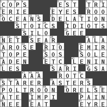 ACROSS 1. 911 reaches them 5. Eastern Standard Time (abbr.) 8. Three (prefix) 11. One of the Great Lakes 12. Sight organs 13. Friend of Pooh 14. Seas 17. Accusation by an informer 19. Unemotional ones 21. Foolish or stupid persons 22. Grain storage tower 23. Unit of force equal to gravity 24. Fish or hair follower 27. Scorch 29. Insect wing 32. Came up 34. River (Sp.) 36. Arab leader 37. Drink excessively 38. Mayday 39. Flatfish 40. Arabian gulf 41. And so on (abbr.) 42. Soviet premier 1918-24 43. French article 44. Indian skirt 46. Girls' org. (abbr.) 47. Auto club (abbr.) 50. College mil. group 52. A viewer who gazes fixedly 55. Michaelmas daisies 57. Coward 59. Threatening words 62. Had dinner 63. Body of Kaffir warriors 64. Ache 65. Born 66. Ingest 67. Jane of fiction DOWN 1. Corporate head (abbr.) 2. The grampus (Milton) 3. Sliced desserts 4. Theater features 5. Sight organ 6. Former Milwaukee Brewers owner Bud 7. Sadhe (variant) 8. Musical group of three 9. Carrot, for example 10. Charged particles 12. Begley and Asner 15. Annoying sound 16. Filth; sediment 18. Standoff 20. Unrefined 24. Brizilian seaport 25. Wear away 26. Drinks excessively 28. Disturbances 29. Amid 30. Ms. Damita and namesakes 31. Sports stadium 33. Elected rep. 35. Motion picture awards 36. Compass dir. 42. 61 cubic inches 45. Printing process, for short 47. Tate display 48. Nest on high 49. Scent 51. Streamer paper 52. Connect, as a bridge 53. Lug 54. Toward shelter 55. Cuckoo 56. Kill 58. Choose 60. Title for a knight 61. Compass dir.