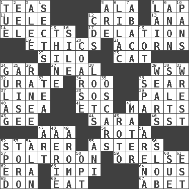 ACROSS 1. Afternoon social gatherings 5. Wing 8. Infant locale 11. Ubangi River tributary 12. Baby bed with high sides 13. Santa ___, CA 14. Chooses 17. Accusation by an informer 19. Value system 21. Oak nuts 22. Grain storage tower 23. Domesticated feline 24. Slender fish 27. Anneal 29. Compass dir. 32. A salt of uric acid 34. Friend of Pooh 36. Scorch 37. Actor's bit 38. Distress signal 39. Light colored 40. At sea 41. And so on (abbr.) 42. Shops 43. Unit of force equal to gravity 44. "Two Mules for Sister ____" 46. Fast jet (abbr.) 47. Auto club (abbr.) 50. Round or rotation of duties 52. A viewer who gazes fixedly 55. Michaelmas daisies 57. Characterized by complete cowardliness 59. Threatening words 62. Period 63. Body of Kaffir warriors 64. Common sense 65. Spanish title 66. Consume 67. Collude with DOWN 1. Third day of the wk. 2. Snakelike fish 3. Toward shelter 4. Religious groups 5. "We ___ not amused" (Victoria) 6. Pale purple color 7. Phillipine bananalike plant 8. Den 9. Soon (poet.) 10. Baking dishes 12. Music discs 15. One or ones belonging to thee 16. Filth; sediment 18. Small child 20. Rough 24. Russian prison camp 25. Ascend 26. Indian princess (variant) 28. Plunders 29. Puts on (as clothing) 30. Table seasonings 31. Take or capture by force 33. Afternoon social gathering 35. Motion picture awards 36. Health resort 42. Mother 45. Printing process, for short 47. Nonscientific branch of learning 48. Nest on high 49. Scent 51. Sports stadium 52. Moved rapidly 53. "Corrida" creature 54. Actor Alda or Thicke 55. Cuckoo 56. Messy guy 58. Elect 60. Take to court 61. Eastern Standard Time (abbr.)