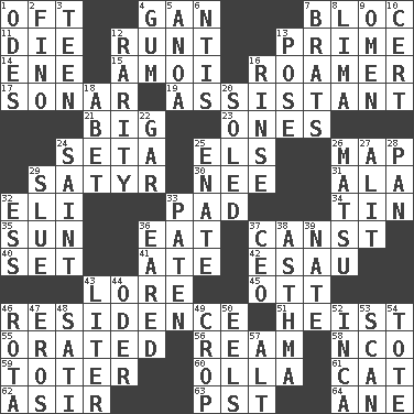 ACROSS 1. Often (poetically) 4. Separate the seeds from cotton 7. Coalition 11. Expire 12. The smallest animal of a litter 13. A-one 14. Compass dir. 15. Mine, in Marseilles 16. Wanderer 17. Echolocation 19. Helper 21. Massive 23. Washington bills 24. Bristle 25. Raised railways 26. Atlas unit 29. Man with strong sexual desires 30. Born 31. In the manner of 32. Biblical high priest 33. Writing tablet 34. Shallow baking pan 35. Player for Phoenix 36. Erode 37. 2nd pers. sing. pres. of can (arch.) 40. Arrange properly for use 41. Had dinner 42. He sold his birthright 43. Old wives' tales, e.g. 45. Baseball player Mel 46. Home 51. Robbery 55. Declaimed 56. 480, 500 or 516 sheets of paper 58. Non-commissioned officer (abbr.) 59. Carrier 60. Rounded earthenware pot or jar 61. Domesticated feline 62. SW Saudi Arabia district 63. Pacific Standard Time (abbr.) 64. A saturated hydrocarbon DOWN 1. Lyric poems 2. A pale, very dry sherry 3. Adolescent 4. Chewing product 5. Small Philippine buffalo 6. Nuclear Threat Initiatives 7. Naughty children 8. Pale green bean 9. Sign of things to come 10. Foregone conclusion 12. Noteworthy scarcity 13. Airs 16. Remove soap 18. Collude with 20. Having a sole or soles 22. Slender fish 24. Inhabitant of Heaven 25. Maternal 26. Taiwanese island in East China Sea 27. Came down and settled, as after flight 28. Baking dish 29. Change direction abruptly 32. Double-curved letter 33. Eucharist need 36. Having ears or earlike features 37. Corporate head (abbr.) 38. Respiratory problem 39. Nathan's nickname 43. 61 cubic inches 44. River in Europe 46. Round or rotation of duties 47. Greek god of love 48. Suttee (variant) 49. Riding implement 50. Snakelike fish 52. South American Indian 53. Examine hastily 54. Carry 57. Keyboard modifier key
