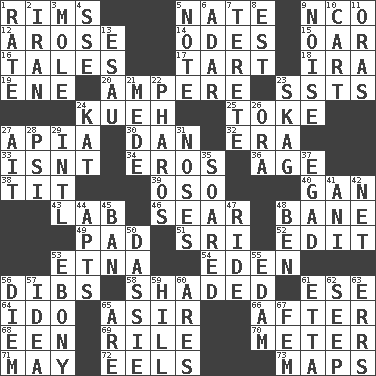 ACROSS 1. Basketball hoops 5. Nathan's nickname 9. Non-commissioned officer (abbr.) 12. Came up 14. Lyric poems 15. Rowing implement 16. Stories 17. Small pie 18. Lyricist Gershwin 19. Compass dir. 20. Electrical Unit 23. Fast planes 24. Malaysian steamed pastry 25. Puff or smoke 27. Capital of Western Samoa 30. One of the 12 tribes of Israel 32. Epoch 33. Is not 34. Greek god of love 36. Personal question 38. Teat (slang) 39. Bear (Spanish) 40. Separate the seeds from cotton 43. Experiment locale 46. Singe 48. Object of repulsion 49. Writing tablet 51. _ Lanka 52. Prepare for publication 53. Inactive volcano in Sicily 54. Genesis locale 56. Claim 58. Cast a shadow over 61. Compass dir. 64. Wedding promise 65. SW Saudi Arabia district 66. Following 68. Car or cant ending 69. Cause heat under the collar 70. Distance measurement 71. Fifth month 72. Snakelike fish 73. Atlas contents DOWN 1. Pace 2. SW Asia republic 3. Undercover agent 4. Compass dir. 5. Short letter 6. The sixth month of the Jewish calendar 7. Cylindrical with tapered ends 8. Eastern Standard Time (abbr.) 9. Annoying sound 10. Heavy open wagon 11. Mouths or openings 13. He sold his birthright 21. Ancient Persian 22. N Egypt peninsula 23. Heroin 24. Krazy ___ of comics 26. Mouth or opening 27. Small island 28. 23rd letter of the Greek alphabet 29. International (abbr.) 31. Olfactory organs 35. Flew 37. Mild oath 41. Black tropical American cuckoo 42. Fish or hair follower 44. Flats, for short 45. Prohibit 47. Travel on or in a vehicle 48. Benjamin's nick name 50. Small ungulate mammals of Africa 53. Black 55. Dutch treat 56. South Vietnam president (1954) 57. The content of cognition 59. Land elevation 60. Ancient Greek god of war 61. Singer James 62. Ooze 63. Blunders 65. "We ___ not amused" (Victoria) 67. Opposite of masc.