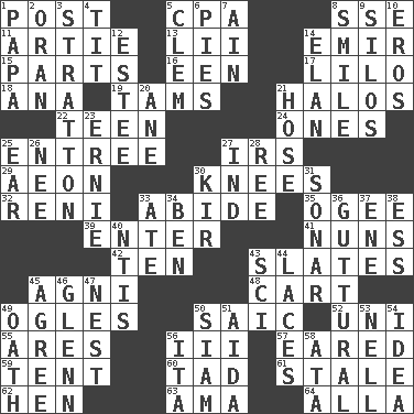 ACROSS 1. Mail 5. Tax preparer (abbr.) 8. Compass dir. 11. Nick name for Arthur 13. Cards in a Roman deck? 14. Arab leader 15. Actors' quests 16. Car or cant ending 17. _ and Stitch 18. Santa ___, CA 19. Scottish caps 21. Saint headwear 22. Adolescent 24. Washington bills 25. Main course 27. Big collection agency 29. A really long time 30. Leg joints 32. Painter Guido (1575-1642) 33. Stay 35. Double curve, resembling the letter S 39. Keyboard key 41. Religious women 42. "___ Little Indians" 43. Chalkboards 45. Hindu god of fire 48. Haul 49. Stares 50. Ketch in the Levant 52. Corn or form start 55. Ancient Greek god of war 56. One more than two 57. Having ears or earlike features 59. Portable shelter 60. Small boy 61. Lacking originality or spontaneity 62. Layer 63. Nanny (var.) 64. Silent film actress Nazimova DOWN 1. Dad 2. Northwest Algerian city 3. Ski resort town in Vermont 4. Teat (slang) 5. To starve (Brit.) 6. Sliced desserts 7. The 18th letter of the Arabic alphabet 8. Grin 9. Grain storage towers 10. Greek god of love 12. First name in cosmetics 14. Liveliness 20. A saturated hydrocarbon 21. Flexible conduit 23. Bert's buddy 25. Ewer handle 26. Born 27. Indiana (abbr.) 28. To riddle 30. Apertif with cassis 31. Echolocation 33. Had dinner 34. Benjamin's nick name 36. From the throat 37. Compass dir. 38. Double-curved letter 40. Nuclear Threat Initiatives 43. _-fi 44. Shoestrings 45. Match 46. American astronaut and politician John 47. A home for chicks 49. Pledge 50. Thailand, formerly 51. Opera by Verdi 53. 1994 drama film starring Jodie Foster 54. The main thing one is thinking about 56. Call ___ day 58. _ moment's notice (2 wds.)