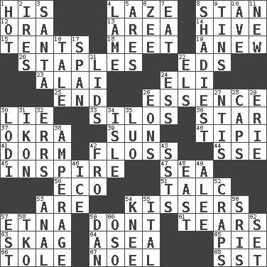 ACROSS 1. Part of HMS, perhaps 4. Goldbrick 8. Comedian Laurel of Laurel & Hardy 12. Mouth or opening 13. Type of rug 14. Hub of activity 15. Portable shelters 18. Confront 19. Afresh 20. Paper fasteners 22. Begley and Asner 23. Mountain range southwest of Kyrgyzstan 24. Biblical high priest 25. Conclude 26. Center 30. Falsehood 33. Grain storage towers 36. Play the lead 37. Gumbo ingredient 39. Player for Phoenix 40. Native american tent (variation) 41. Dormintory (informal) 42. Soft thread for cleaning between teeth 44. Compass dir. 45. Heighten or intensify 47. Ocean 50. Environmental prefix 51. Baby powder 53. "We ___ not amused" (Victoria) 54. Smoochers 57. Inactive volcano in Sicily 59. Do not 61. Pulls into pieces 63. Heroin 64. At sea 65. Sliced dessert 66. Lacquered or enameled metalware 67. Christmas carol 68. Fast jet (abbr.) DOWN 1. Being at a high temperature 2. Angers 3. Before Barbara or Clara 4. Unable to walk 5. Ancient Greek god of war 6. Last letter of the English alphabet 7. Ingest 8. Most questionable 9. Airtight sealed metal containers 10. "___ Maria" 11. ___ Haven, CT 16. Falsehood 17. Connect, as a bridge 21. Flaplike coverings 22. Raised railways 24. Curvy letter 26. Immeasurably long periods of time 27. Nuclear Threat Initiatives 28. Balmoral and tarboosh 29. One of the Great Lakes 30. Farming town in central California 31. Image 32. Blunders 34. Capri or Wight 35. Nilotic language 38. Electrical Measurement 42. Away 43. Fast planes 46. Frozen water 48. 90 degrees 49. Toward shelter 52. Dice game 53. Of or related to the anus 54. Leg joint 55. Slanted text style (abbr.) 56. Indian titles of respect 57. Eastern Standard Time (abbr.) 58. Ring climax 59. Daniel's nick name 60. Bear (Spanish) 62. Arrange properly for use