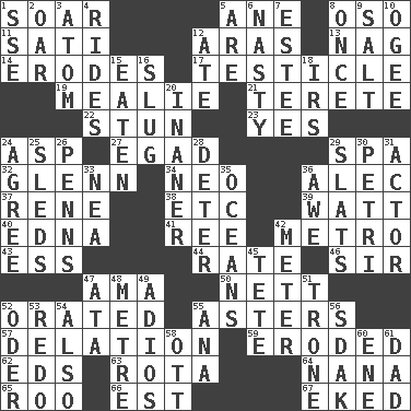 ACROSS 1. Fly high 5. One (Scot) 8. Bear (Spanish) 11. Suttee (variant) 12. Caspian sea tributary 13. Tired old horse 14. Eats (away) 17. One of the two male reproductive glands 19. Ear of corn 21. Cylindrical with tapered ends 22. Make senseless or dizzy 23. Consenting reply 24. Cleo's killer 27. Mild oath 29. Health resort 32. American astronaut and politician John 34. Modern: prefix 36. Actor Baldwin 37. French philosopher Descartes 38. And so on (abbr.) 39. Electrical Unit 40. Pulitzer Prize-winning author Ferber 41. To riddle 42. Paris' subway 43. Curvy letter 44. Assign a rank or rating to 46. Title for a knight 47. Wet nurse (var.) 50. Remaining after all deductions 52. Spoke pompously 55. Michaelmas daisies 57. Conveyance 59. Worn away 62. Begley and Asner 63. Round or rotation of duties 64. Grandmother 65. Friend of Pooh 66. Eastern Standard Time (abbr.) 67. Supplemented with great effort DOWN 1. Compass dir. 2. Rowing implement 3. Smallest unit of an element 4. Amusement-park features 5. "We ___ not amused" (Victoria) 6. Difficult 7. First name in cosmetics 8. Single time 9. Table seasoning 10. Double curve, resembling the letter S 12. Had dinner 15. Eroded 16. Strike heavily 18. Big collection agency 20. Sillier 24. Match 25. Bobsleighs 26. Actor Sean's family 28. Prevent from occurring 29. Narrow boards 30. _ dish (used to culture cells) 31. Thespian 33. Teachers' org. 35. Seas 36. Deep reverence 42. Distance measurement 45. Wig 47. "One Day ___ Time" 48. Distance measurement (Brit.) 49. Goodbye (Sp.) 51. Heavy duty weighing machine 52. Baltic tributary 53. Make new 54. In addition 55. Santa ___, CA 56. Neighbor of Neb. 58. Baseball player Mel 60. Compass dir. 61. Male parent