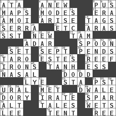 ACROSS 1. "One Day ___ Time" 4. Afresh 8. Tenth month of the Hindu calendar 11. Atlas contents 13. Methods 15. Period 16. Mine, in Marseilles 17. Get up 18. Labels 19. Father Junipero _ 21. And so on (abbr.) 22. Caspian sea tributary 23. Fast jet (abbr.) 24. ___ Haven, CT 27. Scottish cap 29. The sixth month of the Jewish calendar 30. Soup utensil 34. Arrange properly for use 36. Back-to-school mo. 39. Depends 40. Edible starchy tuberous root 41. _____ Park, CO 43. Coral ridge 44. Removes the wrinkles 46. Hyperbolic tangent 47. Curvy letter 48. Relating to the nose 49. Texas town _ City 51. Potassium hydroxide 53. R.R. building 54. Pacific Standard Time (abbr.) 57. Mountain range 60. Was introduced to 63. A sleeping potion; an opiate (poet.) 65. Rowboat 66. Feeling or showing extreme anger 69. Practice fight 70. The first octave above the treble staff 71. Stories 72. Moistens 73. Area sheltered from the wind 74. Portable shelter 75. Portuguese money of account (variant) DOWN 1. Collect or gather 2. Corrects by punishment or discipline 3. To the left, to Queeg 4. Housemaid (var.) 5. Or not 6. Singer Brickell 7. Compass direction 8. Lightbulb-shaped fruit 9. Capital and largest city of Mongolia 10. Backtalk 12. Title for a knight 14. Religious group 18. ________ with (broke a safety seal) 20. Added to 25. Comfort 26. Take or capture by force 28. Viper 29. Without tonality 31. Washington bills 32. Lyric poems 33. Science/research agcy. 34. "Two Mules for Sister ____" 35. Greek god of love 37. Parent Teacher Assoc. 38. Looks after 40. Shallow baking pan 42. Attempt 45. Roguish 50. June honoree 52. Send forth 54. Some stationery 55. Chalkboard 56. Laconic 57. Allodial 58. Hero or heavy, e.g. 59. Johnson of "Laugh-In" 61. Part of Q.E.F. 62. Falsehood 64. Compass dir. 67. "___ Little Indians" 68. Eastern Standard Time (abbr.)