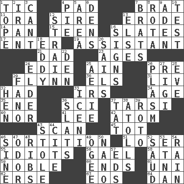 ACROSS 1. Nervous spasm 4. Writing tablet 7. Naughty child 11. Mouth or opening 12. Father 13. Wear away 14. Baking dish 15. Adolescent 16. Chalkboards 17. Keyboard key 19. Helper 21. June honoree 23. Ripens 24. Singer Brickell 25. The 18th letter of the Arabic alphabet 26. Before (prefix) 29. Film actor Errol 30. Raised railways 31. 54 in ancient Rome 32. Possessed 33. Big collection agency 34. Ripen 35. Compass dir. 36. _-fi 37. Tarsus (plural) 40. And not 41. Area sheltered from the wind 42. Tiny particle 43. Glance over 45. Small child 46. Drawing lots 51. Failure 55. Foolish or stupid persons 56. Highlander 58. _ moment's notice (2 wds.) 59. Impressive in appearance 60. Extremities 61. Single; one (prefix) 62. Celtic language 63. Greek goddess of the dawn 64. Daniel's nick name DOWN 1. Drink excessively 2. SW Asia republic 3. Patter 4. Sliced dessert 5. Length times width 6. Cub Scout units 7. Naughty children 8. Round or rotation of duties 9. An important port of Yemen 10. Trial 12. Put through a sieve 13. Otherwise 16. Attaches a signature 18. Whirlpool 20. Travel by water 22. Lair 24. A person who is older than you are 25. Nest on high 26. Suffix with ecto or cyto 27. Swiss mountan, "Queen of the Mountains" 28. Night before a holiday 29. Papal veil 32. Layer 33. Ancient Celtic tribe of eastern Britain 36. Narrow boards 37. Make lace 38. Ringlike coral islands and reefs 39. Printing process, for short 43. Fur scarf 44. Quote 46. Trig term 47. Scent 48. Teases 49. Double curve, resembling the letter S 50. Billionth: prefix 52. Saudi Arabian king (1953-1964) 53. Inactive volcano in Sicily 54. Water falling in drops from the sky 57. Begley and Asner