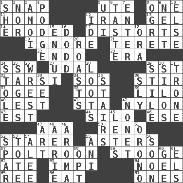 ACROSS 1. Fastener 5. Shoshoni 8. Single 11. Same (prefix) 12. SW Asia republic 13. Set 14. Worn away 17. What propaganda does 19. Disregard 21. Cylindrical with tapered ends 22. Inside; within (prefix) 23. Period 24. Compass dir. 27. Hereditary estate 29. Fast jet (abbr.) 32. Tarsus (plural) 34. Mayday 36. Commotion 37. Double curve, resembling the letter S 38. Small child 39. _ and Stitch 40. For fear that 41. R.R. building 42. Thermoplastic polyamide 43. Eastern Standard Time (abbr.) 44. Grain storage tower 46. Compass dir. 47. American Automobile Association (abbr.) 50. Western Nevada city 52. A viewer who gazes fixedly 55. Michaelmas daisies 57. Coward 59. Moe Howard, for one 62. Had dinner 63. Body of Kaffir warriors 64. Christmas carol 65. To sift 66. Ingest 67. Washington bills DOWN 1. A female animal or person 2. Or not 3. Mine, in Marseilles 4. Puddle 5. RI univ. 6. Clothes sense 7. Keyboard key 8. Legendary monster 9. Remaining after all deductions 10. Otherwise 12. Binary compound 15. World-weariness 16. Texas town _ City 18. Mouth or opening 20. Ridicules or criticizes harshly 24. Took without asking 25. Gurus 26. Take or capture by force 28. Plunders 29. Vertical member of a panel or frame 30. Grain storage towers 31. Marketplace scale 33. Arrange properly for use 35. Flight of steps 36. Cunning 42. Music written for nine 45. Allows 47. Nonscientific branch of learning 48. Nest on high 49. Scent 51. U. of Maine site 52. Practice fight 53. Lug 54. Toward shelter 55. Black tropical American cuckoo 56. Within a short period 58. Elect 60. Turn to the right 61. Raised railways