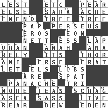 ACROSS 1. For fear that 5. And so on (abbr.) 8. Lightbulb-shaped fruit 12. Otherwise 13. "Two Mules for Sister ____" 15. 1/640 square mile 16. Make improvements or corrections to 18. Not kosher 19. Family _ (genealogy) 20. Infant food 22. Son of Zeus who helped slay Medusa 24. Greek god of love 26. A really long time 27. Remaining after all deductions 28. Curvy letter 29. Pet locale 32. Northwest Algerian city 35. Wet nurse 37. Santa ___, CA 38. Depend 39. It is 40. Son of Odin 41. Black tropical American cuckoo 42. Celtic language 43. Part of Q.E.F. 44. Allow 45. Raised railways 46. Tennis shots 49. "We ___ not amused" (Victoria) 50. Argument over a trivial matter 51. Flamboyance 55. Three (prefix) 56. Had on 57. Beverages made from leaves 59. Lean end of the neck 63. At sea 64. Backtalk 65. Not recorded 66. Buttocks 67. Morning condensation 68. Locale of original sin DOWN 1. Area sheltered from the wind 2. Shade tree 3. Compass dir. 4. 3-inch nail 5. Eastern Standard Time (abbr.) 6. Canvas cover 7. Algonquian 8. Eucharist need 9. Shade of tan 10. Ancient Greek god of war 11. To sift 14. Anew 17. Have the gumption 21. Cooking vessel 23. Mayday 25. Flight of steps 28. Artist's stands 29. Cowardly lion portrayer 30. Small Philippine buffalo 31. Role in a play 32. Relating to the mouth 33. French philosopher Descartes 34. Set down 36. Mountains (abbr.) 40. One of the two male reproductive glands 42. Chooses 45. Period 47. Elect 48. Long, evenly shaped pieces 49. Approach 51. Introduce or present, as a question 52. Length times width 53. Froth on beer 54. Comfort 56. Armed conflict 58. Compass dir. 60. To free from 61. "___ Maria" 62. Commissioned mil. rank