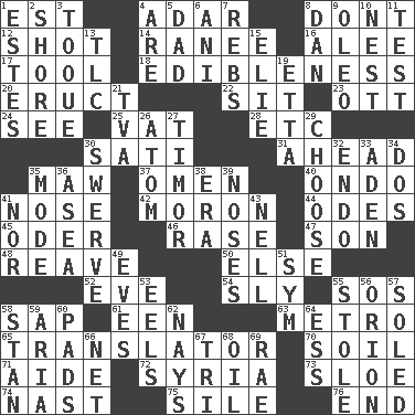 ACROSS 1. Eastern Standard Time (abbr.) 4. The sixth month of the Jewish calendar 8. Do not 12. Attempt 14. Indian princess (variant) 16. Toward shelter 17. Implement 18. The property of being fit to eat 20. Spew [out] 22. Be seated 23. Baseball player Mel 24. Perceive with the eye 25. Large container 28. And so on (abbr.) 30. Suttee (variant) 31. Having the leading position 35. Informal term for the mouth 37. Presage 40. Southwest Nigerian state 41. Sense of smell 42. Person of subnormal intelligence 44. Lyric poems 45. River in Europe 46. Raze (variant) 47. Male offspring 48. Rob, plunder, or pillage 50. Otherwise 52. First lady 54. Wily 55. Distress signal 58. Plant excrement 61. Car or cant ending 63. Paris' subway 65. Interpreter 70. Earth 71. Assistant 72. Damascus' land 73. _ gin 74. Political cartoonist Thomas 75. Drop; flow; fall 76. Conclusion DOWN 1. _____ Park, CO 2. Dinah or Pauly 3. Woman's close-fitting hat 4. "We ___ not amused" (Victoria) 5. June honoree 6. Cuckoo 7. Confederate soldiers (slang) 8. Daniel's nick name 9. Margarine 10. Egg locale 11. Trial 13. Affectionate concern, for short 15. Writer Wiesel 19. Singer James 21. Federal power corp. 26. Tiny particle 27. The easternmost of the Lesser Sundas 29. Opt 30. Turn aside suddenly 32. Inside; within (prefix) 33. Arabian gulf 34. Two (Sp.) 35. Method 36. Toward the sea 38. Epoch 39. Olfactory organs 41. Not either 43. 1994 drama film starring Jodie Foster 49. Nights before holidays 51. Symbol (abbr.) 53. Snakelike fish 55. Took without asking 56. Constellation of myth 57. Having a sole or soles 58. Comedian Laurel of Laurel & Hardy 59. Operatic vocal solo 60. Writing tablets 62. Negative votes 64. Double-curved letter 66. Fish or hair follower 67. Three (prefix) 68. Lubricate 69. Actress Charlotte