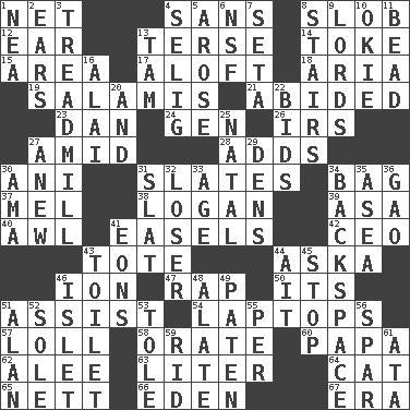 ACROSS 1. Fish or hair follower 4. Without 8. Oscar Madison type 12. Hearing organ 13. Laconic 14. Puff or smoke 15. Length times width 17. High up in or into the air 18. Roberta Peters solo 19. Deli grouping 21. Tolerated 23. One of the 12 tribes of Israel 24. Commissioned mil. rank 26. Big collection agency 27. Among 28. Sums up 30. Black tropical American cuckoo 31. Chalkboards 34. Paper or plastic container 37. Cartoonist voice _ Blanc 38. Utah city north of Ogden 39. White ___ sheet 40. Leather borer 41. Artist's stands 42. Corporate head (abbr.) 43. Haul 44. "____ silly question..." 46. Electrically charged atom 47. Hit sharply and swiftly 50. It is 51. Help 54. Portable computers 57. Hang loosely or laxly 58. Declaim 60. Dad 62. Toward shelter 63. 61 cubic inches 64. Domesticated feline 65. Remaining after all deductions 66. Locale of original sin 67. Period DOWN 1. Teachers' org. 2. Hearing organs 3. Excercise machine 4. Major League Baseball Commissioner Bud 5. Came up 6. Overdraft (abbr.) 7. Bristle 8. Flight of steps 9. Titled peers of a realm 10. Migrant worker of the '30s 11. Necklace unit 13. Scottish cap 16. Jai _ 20. Added to 22. Auction offers 25. Brizilian seaport 27. Afresh 29. Lairs 30. Wet nurse (var.) 31. Narrow board 32. Failure 33. Mature 34. Keyboard key 35. At sea 36. E Mali city 41. Immeasurably long periods of time 43. Bathroom 44. Small island 45. Obstruct or block passage 46. Small island 48. Having winglike extensions 49. Eucharist need 51. ____ Jay Lerner 52. Not divided or shared with others 53. Lacquered or enameled metalware 55. For each 56. Coast Guard woman 59. To free from 61. _ moment's notice (2 wds.)