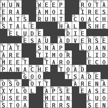 ACROSS 1. Attila the _ 4. Shed a tear 8. Roll call or roster of names 12. Period 13. Mine, in Marseilles 14. Angers 15. Floor protectors 17. Undersized animal 18. Team commander 19. Having lost freshness 21. Actor Linden 23. A female animal or person 24. Evade 26. Pass on 28. He sold his birthright 30. Contrary to your interests or welfare 34. Make lace 37. Fastener 39. Grant temporary use of 40. "We ___ not amused" (Victoria) 41. The easternmost of the Lesser Sundas 43. Flaplike covering 44. Confront 46. Edible starchy tuberous root 47. Environmental prefix 48. Flamboyance 51. Frog relative 54. Thick or sticky substance 55. Sadhe (variant) 58. Bear (Spanish) 61. Baseball player Mel 63. Sports stadium 65. Xylene (variant) 67. Domed church section 71. Comfort 72. One who makes use of a thing 73. Chow _ 74. Nilotic language 75. Portico 76. Blunders 77. Elected rep. DOWN 1. Folds over and sews together 2. A salt of uric acid 3. Brizilian seaport 4. Armed conflict 5. Australian flightless bird 6. Period of immesurable duration 7. Essential or central part 8. _ de Janeiro 9. Mouths or openings 10. Technician 11. American tennis player Robert 16. Change direction abruptly 18. 154 in Roman numerals 20. Begley and Asner 22. Say or write further 25. 90 degrees 27. Snakelike fish 29. Join together 30. To the left, to Queeg 31. Hero or heavy, e.g. 32. Ketch in the Levant 33. Inside; within (prefix) 34. Pack (down) 35. Length times width 36. Adolescent 38. Wet nurse (var.) 42. Carrot, for example 45. Label 49. Calm and collected 50. Being at a high temperature 52. White ___ sheet 53. Have the gumption 56. Allots cards 57. Follow as a consequence or result 58. Amu Darya 59. System (abbr.) 60. Margarine 62. Not wild 64. A really long time 66. Mouth or opening 68. For each 69. Title for a knight 70. Followers of ems