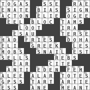 ACROSS 1. Ancient Roman robes 6. Compass dir. 9. Actress Charlotte 12. Maternal 13. Prejudice 14. Signal 15. 13-14th century defensive garment 16. Writer Wiesel 17. Double curve, resembling the letter S 18. Snakelike fish 19. Group of countries in special alliance 20. Scottish caps 21. Plunder 23. Retirement account (abbr.) 24. Son of Isaac 25. Laconic 28. Possessed 30. Strips of potato fried in deep fat 34. Capital of the state of Qatar 35. Biblical high priest 36. Of Greece 38. French article 39. Disorderly crowds 41. Slow-paced one 43. Eastern Standard Time (abbr.) 44. Exchanges for money 46. Confederate soldiers (slang) 48. Ewer handle 49. Quote 50. Against 51. Genesis locale 53. Opposite of masc. 56. Toward shelter 57. Having or resembling wings 58. Hauls 60. Global Positioning Systems (abbr.) 61. Small pie 62. Nick name for Arthur 63. Curvy letter 64. A saturated hydrocarbon 65. Intended DOWN 1. Afternoon social gathering 2. Single time 3. Yard entry 4. Ringlike coral islands and reefs 5. Elected rep. 6. Grain storage tower 7. Ketch in the Levant 8. Compass dir. 9. Frustrating wastes of time 10. Eras 11. Compass dir. 13. Waist strap 14. Flew 19. Town 20. Teat (slang) 22. Clumsy lout 24. The property of being fit to eat 26. "______ My Girl" (Turtles hit) 27. Compass direction 28. Cloth borders 29. Medicinal plant 31. Big collection agency 32. Car or cant ending 33. Ocean 37. Japanese brewing company 40. Chalkboards 42. Allow 45. _ Lanka 47. Prior to 49. Certainty 50. High mountains 51. Liveliness 52. Have the gumption 54. Singer James 55. Count _ (2 wds.) 56. Personal question 57. "One Day ___ Time" 58. Scottish cap 59. Arrange properly for use