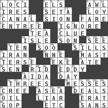 ACROSS 1. Venues 5. Raised railways 8. Leather borer 11. Angers 12. Stalk of a moss capsule 14. Myrna of the movies 15. Lessep's creation 17. The Jewish people; Israel 18. Conductor's collection 19. Main course 21. Fail to notice 23. Afternoon social gathering 25. A slight indication 26. Capri or Wight 27. Manchild 28. Observe 31. "___ Little Indians" 33. "Barney Miller" actor Jack 35. Beverly of Met fame 37. SW Asia republic 38. Compass dir. 40. Vertical spar for supporting sails 41. Laconic 43. Supplement with great effort 45. Had dinner 46. Elected rep. 47. To free from 50. Whirlpool 52. Opera by Verdi 53. 24 hours 54. Triads 56. Makes clutter 61. Algonquian 62. At sea 65. Allots cards 66. Petroleum 67. One who doesn't tell the truth 68. Part of Q.E.F. 69. Republican Party 70. And so on (abbr.) 71. Without DOWN 1. Louse (plural) 2. NW Algerian seaport 3. Penny 4. Austrian river, tributary to the Danube 5. Double-curved letter 6. Flowery wreath 7. Unemotional ones 8. Having or resembling wings 9. Had on 10. Potassium hydroxide 13. White American of non-Hispanic descent 16. Allows 18. Enemy 20. Snakelike fish 22. Religious women 24. Age 26. Restaurants 28. Narrow board 29. Otherwise 30. Eastern Standard Time (abbr.) 31. Relationship diagram 32. Merit 34. Single 36. "If ____ say so..." 37. It is 39. Supplemented with great effort 42. One of the Great Lakes 44. Dutch treat 48. Perfect 49. Small ungulate mammals of Africa 51. Colored 52. "We ___ not amused" (Victoria) 54. Musical group of three 55. Aid 57. Observes 58. "Two Mules for Sister ____" 59. Liveliness 60. Fast planes 61. Gear tooth 63. Ingest 64. Curve