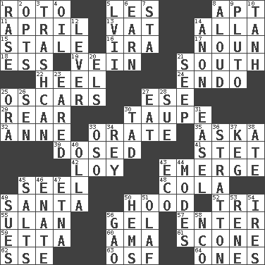 ACROSS 1. Printing process, for short 5. French article 8. Fitting 11. Showery time 13. Large container 14. Silent film actress Nazimova 15. Lacking originality or spontaneity 16. Retirement account (abbr.) 17. Part of speech 18. Double-curved letter 19. Distinctive style or manner 21. 180 degrees 22. The bottom of a shoe or boot 24. Inside; within (prefix) 25. Motion picture awards 27. Compass dir. 29. Tail end 30. Grayish beige 32. Singer Murray 33. Declaim 35. "____ silly question..." 39. Administered medicine 41. Proofreading order 42. Myrna of the movies 43. Develop 45. Sew up the eyelids of hawks and falcons 48. Root beer relative 49. Before Barbara or Clara 50. Parka part 52. Three (prefix) 55. Uhlan (variant) 56. Set 57. Keyboard key 59. Singer James 60. Wet nurse (var.) 61. Biscuitlike quick bread 62. Compass dir. 63. Order of Saint Francis (abbr.) 64. Singles DOWN 1. Raze (variant) 2. Chooses 3. File 13 4. Petroleum 5. 57 in ancient Rome 6. Merit 7. R.R. building 8. Verbally 9. Greek god of the underworld 10. Hyperbolic tangent 12. Prying instrument 14. At once, immediately (arch.) 20. Raised railways 21. Ooze 23. Having ears or earlike features 25. Mouth or opening 26. Elected rep. 27. Ingest 28. Institute legal proceedings 30. Small boy 31. Artist's stand 33. Bear (Spanish) 34. Marina Del _, California 36. Ski resort town in Vermont 37. Barrel 38. Had dinner 40. Spanish pot 43. Environmental prefix 44. Methods 45. Table seasonings 46. Related on the mother's side 47. Inactive volcano in Sicily 49. Takes to court 50. Is hesitant and indecisive 51. Norwegian king 53. French philosopher Descartes 54. Angers 56. E Mali city 58. Non-commissioned officer (abbr.)