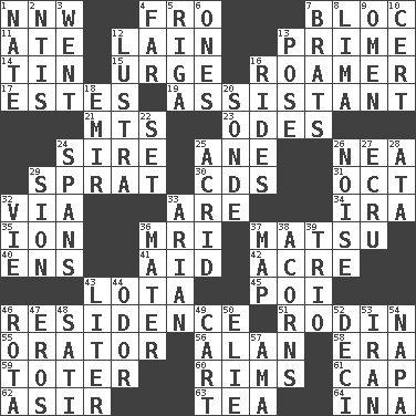 ACROSS 1. Compass dir. 4. Away 7. Coalition 11. Had dinner 12. (Had) reclined 13. First class 14. Shallow baking pan 15. Goad 16. Wanderer 17. _____ Park, CO 19. Helper 21. Mountains (abbr.) 23. Lyric poems 24. Father 25. A saturated hydrocarbon 26. Teachers' org. 29. Small fatty European fish 30. Music discs 31. Sep. follower 32. By way of 33. "We ___ not amused" (Victoria) 34. Retirement account (abbr.) 35. Electrically charged atom 36. Medical imaging device (abbr.) 37. Taiwanese island in East China Sea 40. Followers of ems 41. Help 42. 1/640 square mile 43. Globular water bottle used in Asia 45. Luau course 46. Home 51. "The Thinker" sculptor 55. Speaker 56. ____ Jay Lerner 58. Epoch 59. Carrier 60. Basketball hoops 61. Head covering 62. SW Saudi Arabia district 63. Afternoon social gathering 64. _ tizzy (2 wds.) DOWN 1. Nathan's nickname 2. Nuclear Threat Initiatives 3. Gone 4. Distant 5. Port city in Latvia 6. Washington bills 7. Naughty children 8. Pale green bean 9. Sign of things to come 10. An absolute certainty 12. A period of five years 13. Introduce or present, as a question 16. Amusement-park features 18. Independent ruler or chieftain 20. Something which is sent 22. Put into a specified state 24. Connects, as a bridge 25. Sour-tasting 26. Annoying sound 27. Shade of tan 28. "One Day ___ Time" 29. The Jewish people; Israel 32. Compete 33. Believer in; advocate of (suffix) 36. Mother 37. Atlas unit 38. Oak nuts 39. Musical group of three 43. 61 cubic inches 44. Aroma 46. Round or rotation of duties 47. Greek god of love 48. Suttee (variant) 49. Draw slowly or heavily 50. Writer Wiesel 52. Tenth: prefix 53. SW Asia republic 54. California wine valley 57. Housemaid (var.)