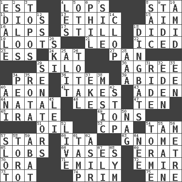 ACROSS 1. Eastern Standard Time (abbr.) 4. Chops off 8. R.R. building 11. "Vaya con ____" 13. Value system 15. Direct toward a target or goal 16. High mountains 17. Free from disturbance or agitation 18. "You Light Up My Life" star Conn 19. Plunders 21. Lion 22. On the rocks 23. Curvy letter 24. Krazy ___ of comics 27. Baking dish 29. Grain storage tower 30. Match 34. Before (prefix) 36. A whole individual unit 39. Remain 40. Age 41. Proceeds 43. Arabian gulf 44. Relating to or accompanying birth 46. For fear that 47. "___ Little Indians" 48. Feeling or showing extreme anger 49. Charged particles 51. Lubricate 53. Accounting whiz (abbr.) 54. Scottish cap 57. Play the lead 60. Call ___ day 63. Dwarf 65. Tennis shots 66. Flower holders 69. Part of Q.E.F. 70. Mouth or opening 71. Poet Dickinson 72. Independent ruler or chieftain 73. Small child 74. Demure 75. Compass dir. DOWN 1. Peak District village in England 2. Grain storage towers 3. Literary convention 4. French article 5. Baseball player Mel 6. Silvers or Donahue 7. Filth; sediment 8. Ketch in the Levant 9. Event that recurs at intervals 10. Among 12. Fast jet (abbr.) 14. Hoof sound 18. Empty-headed or silly people 20. What Jean-Claude Killy likes to do 25. Came down and settled, as after flight 26. "_____ Recall" 28. Auto club (abbr.) 29. Legislators 31. Travel on an animal 32. Locale of original sin 33. Car or cant ending 34. Lightbulb-shaped fruit 35. Roll call or roster of names 37. Supplement with great effort 38. Mesonic 40. Cuckoo 42. Constrict 45. Flowery wreath 50. Tired old horse 52. Moving, as bait 54. Singer Mel 55. At full speed 56. Distance measurement (Brit.) 57. Position in a hierarchy or organization 58. "Corrida" creature 59. Blind as ____ 61. Pack (down) 62. SW Saudi Arabia district 64. Born 67. Connecticut Ivy Leaguer 68. Symbol (abbr.)
