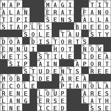 ACROSS 1. Atlas unit 4. Wise men 8. Teat (slang) 11. ____ Jay Lerner 13. Part of Q.E.F. 14. Papal veil 15. Native american tent (variation) 16. Elected reps. 17. Silent film actress Nazimova 18. Paper fasteners 21. A special lineage 22. Flatfish 23. The 19th letter of the Greek alphabet 25. Filthy place 26. ___ good deed 29. What propaganda does 32. World-weariness 34. Being at a high temperature 35. Immediately 38. Moistens 39. Vertical member of a panel or frame 41. The main thing one is thinking about 43. Small drink 44. The 18th letter of the Arabic alphabet 45. To the left, to Queeg 46. SAT takers 50. To riddle 51. Crowd into 54. Binary compound 55. Length times width 57. Learning spot: Fr. 59. Player piano 63. French philosopher Descartes 64. Central Nebraska county 67. Ancient Greek god of war 68. Long (Scottish) 69. Celtic language 70. Thin strip of wood or metal 71. Compass dir. 72. On the rocks 73. Compass dir. DOWN 1. Floor protectors 2. Came down and settled, as after flight 3. Dad 4. Makes clutter 5. "We ___ not amused" (Victoria) 6. Separate the seeds from cotton 7. ___ a Wonderful Life 8. Falsehoods 9. An arm off of a larger body of water 10. Sycophant 12. Pinches, bites 14. Distant 19. Farming town in central California 20. Biblical high priest 21. On the contrary 23. Implement 24. Johnson of "Laugh-In" 26. Morning condensation 27. Washington bills 28. Opposed to 30. One or ones belonging to thee 31. Sever or remove by pinching or nipping 33. United States Postal Service (abbr.) 36. Scent 37. We are 39. Saudi Arabian king (1953-1964) 40. Periodic rise and fall of the sea level 42. Had dinner 45. At sea 47. Standoff 48. Slept 49. Three (prefix) 51. Haggard of country music 52. Sea 53. Child's nurse 56. Of or related to the anus 58. Part of a journey 60. Mouths or openings 61. Allows 62. American tennis player Robert 64. Luau accessory 65. The grampus (Milton) 66. Purpose