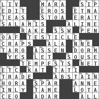 ACROSS 1. 54 in ancient Rome 4. Hindu Mythology: god of death 8. Small drink 11. Prepare for publication 13. Greek god of love 14. Inactive volcano in Sicily 15. Beverages made from leaves 16. Portico 17. Part of Q.E.F. 18. Deli grouping 21. Place in a line 22. Immoral or dissolute person 23. Compass dir. 25. Fenced enclosure 26. Clumsy lout 29. A testis 32. Dice game 34. According to 35. Compass dir. 38. Edible starchy tuberous root 39. NE Netherlands city 41. Dormintory (informal) 43. It is so 44. Allow 45. Boozer 46. Storms 50. Fish or hair follower 51. And so on (abbr.) 54. Krazy ___ of comics 55. Jacques of French films 57. Buy and sell 59. Refrain by choice 63. Israeli folk dance 64. Practice fight 67. Queen of England 1702-14 68. In an inward manner 69. Not wild 70. Globular water bottle used in Asia 71. Corporate head (abbr.) 72. The sixth month of the Jewish calendar 73. Everything DOWN 1. Allows 2. The content of cognition 3. Small bottle 4. Makes clutter 5. Tate display 6. Friend of Pooh 7. White ___ sheet 8. Remove all contents or possession from 9. Empty; void 10. Eucharist need 12. Russian ruler of old 14. Snakelike fish 19. Floor protectors 20. D.D.E's nickname 21. Leather borer 23. Filth; sediment 24. Examine minutely or intensely 26. Sep. follower 27. Like ___ of sunshine 28. Conductor's collection 30. Clothes sense 31. Inside; within (prefix) 33. Mail 36. Part of speech 37. Celtic language 39. _ mater 40. Back-to-school mo. 42. Was introduced to 45. Fast planes 47. Supplement with great effort 48. A viewer who gazes fixedly 49. Bar bill 51. Value system 52. Marketplace scale 53. Monte _, Las Vegas Hotel/Casino 56. Slanted text style (abbr.) 58. 24 hours 60. Small Philippine buffalo 61. International (abbr.) 62. Be tempered by heat 64. R.R. building 65. Groovy apt. 66. Housemaid (var.)