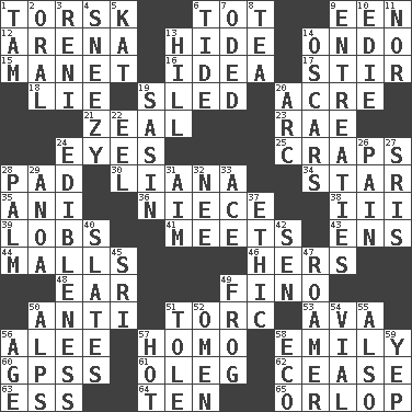 ACROSS 1. Cod relative 6. Small child 9. Car or cant ending 12. Sports stadium 13. Flintstone garb 14. Southwest Nigerian state 15. French painter Edouard 16. The main thing one is thinking about 17. Disorderly outburst 18. Untruth 19. Downhill vehicle 20. 1/640 square mile 21. Ardor 23. Actress Charlotte 24. Sight organs 25. Dice game 28. Groovy apt. 30. Climbing, woody, usually tropical vines 34. Play the lead 35. Cuckoo 36. Sibling's daughter 38. One more than two 39. Tennis shots 41. Confronts 43. Followers of ems 44. Promenades 46. Possessive pronoun 48. Hearing organ 49. Fine (Spanish) 50. Opposed to 51. Torque (variant) 53. Actress Gardner 56. Toward shelter 57. Like (prefix) 58. Poet Dickinson 60. Global Positioning Systems (abbr.) 61. Cassini of fashion 62. Stop 63. Double-curved letter 64. "___ Little Indians" 65. Lowest deck of a ship DOWN 1. Scottish cap 2. Of the mouth 3. Painter Guido (1575-1642) 4. Dwarf with a sinus problem 5. Krazy ___ of comics 6. Event that recurs at intervals 7. Wrote a lyric poem 8. Beverage made from leaves 9. Pleas 10. Singer Brickell 11. Or not 13. Land elevation 14. Motion picture awards 19. Indian antelope 20. Curve 22. Snakelike fish 24. The property of being fit to eat 26. Ache 27. Indian titles of respect 28. Inside of hand 29. Small Philippine buffalo 31. Direct toward a target or goal 32. Born 33. Adept person 37. Value system 40. Chalkboards 42. Elected rep. 45. Indian title of respect (Mr.) 47. Wanderer 49. Tree-dwelling hopper 50. High mountains 51. Lacquered or enameled metalware 52. Presage 54. Small bottle 55. In addition 56. Personal question 57. Being at a high temperature 58. Environmental prefix 59. Slangy assent