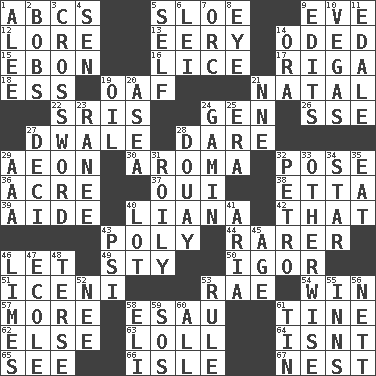 ACROSS 1. Lettered men learn these first 5. A type of plum 9. First lady 12. Old wives' tales, e.g. 13. Suggestive of the supernatural 14. Wrote a lyric poem 15. Inky black, to poets 16. Louse (plural) 17. Capital of Latvia 18. Curvy letter 19. Clumsy lout 21. Brizilian seaport 22. Indian titles of respect 24. Commissioned military rank (abbr.) 26. Compass dir. 27. A sleeping potion; an opiate (poet.) 28. Have the gumption 29. Period of immesurable duration 30. Scent 32. Airs 36. Measure of real estate 37. Fr. "Yes" 38. Singer James 39. Assistant 40. Climbing, woody, usually tropical vines 42. Not this but _ 43. Many (prefix) 44. Less widely known 46. Allow 49. Filthy place 50. Russian composer Stravinsky 51. Ancient Celtic tribe of eastern Britain 53. Actress Charlotte 54. Victory 57. Greater amount 58. Son of Isaac 61. Prong on a fork 62. Otherwise 63. Hang loosely or laxly 64. Is not 65. Observe 66. Small island 67. A home for chicks DOWN 1. Toward shelter 2. Moves up and down 3. What you're doing now 4. Elected rep. 5. Automatic 6. Luau accessory 7. The grampus (Milton) 8. Sight organ 9. Proofreads 10. Viva Las _ 11. Peak District village in England 14. Mouth or opening 19. Petroleum 20. At sea 21. Compass dir. 23. Indian princess (variant) 24. Street urchin 25. Epoch 27. Tenth: prefix 28. A city in N France, SE of Calais 29. Auto club (abbr.) 31. Agitated, as a liquid 32. Stone: prefix 33. Else 34. Play the lead 35. Ingest 40. Car dealer's back yard 41. Operatic vocal solo 43. Air pressure measure (abbr.) 45. Ripen 46. Citrus fruits 47. Learning spot: Fr. 48. Laconic 52. Born 53. Governing power 55. Taverns 56. Remaining after all deductions 58. Connecticut Ivy Leaguer 59. Distress signal 60. Everything 61. Metal container