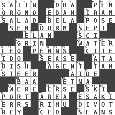 ACROSS 1. Smooth fabric 6. Chief or king in Benin or Nigeria 9. Writing instrument 12. U. of Maine site 13. Dutch treat 14. SW Asia republic 15. Vegetable dish 16. Actor Lugosi 17. Airs 18. Elected rep. 19. Dormintory (informal) 20. Back-to-school mo. 21. Style 23. _-fi 24. Smile widely 25. Wetness 28. Lion 30. Actor Sean's family 34. Quote 35. Wedding promise 36. Gospel singer Marvin 38. _ moment's notice (2 wds.) 39. Food container 41. Representative 43. Scottish cap 44. Bull 46. Assistant 48. Sound made by sheep 49. Inactive volcano in Sicily 50. Past tense of be (plural) 51. Celtic language 53. What Jean-Claude Killy likes to do 56. Left side of a ship or aircraft 57. Type of rug 58. 1973 Nobel Price Winner (Physics) Leo 60. Blunders 61. Tall New Zealand timber tree 62. A piece of turf (Scot.) 63. Marina Del _, California 64. Corporate head (abbr.) 65. Seines DOWN 1. Distress signal 2. Caspian sea tributary 3. Lacquered or enameled metalware 4. More empty; more void 5. Lower and raise head in agreement 6. Baltic tributary 7. Lip ointment 8. Nanny (var.) 9. Appease 10. 90 degrees 11. Compass dir. 13. Inky black, to poets 14. Medicinal drug used to evoke vomiting 19. Natives or inhabitants of Denmark 20. Compass dir. 22. Mouth edge 24. Sour, prickly fruit 26. Singer James 27. 480, 500 or 516 sheets of paper 28. Hats (slang) 29. Prepare for publication 31. Teachers' org. 32. Tired old horse 33. Compass dir. 37. Maternal 40. Centers 42. Metal container 45. Actress Charlotte 47. Small ungulate mammals of Africa 49. Son of Isaac 50. Had on 51. 4th largest of the Great Lakes 52. San ____ (Riviera town) 54. Polynesian shrub of the pepper family 55. Image 56. For each 57. Curve 58. Begley and Asner 59. It is