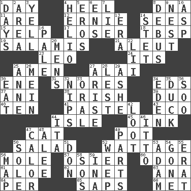 ACROSS 1. 24 hours 4. Person who is morally reprehensible 8. Heredity factor (abbr.) 11. "We ___ not amused" (Victoria) 12. Bert's buddy 14. Perceives with the eye 15. Sharp bark 17. Failure 18. Cook's measure (abbr.) 19. Deli grouping 21. Eskimo relative 23. Lion 24. ___ a Wonderful Life 25. So be it 27. Jai ____ 30. Compass dir. 31. Sounds asleep 34. Begley and Asner 37. Cuckoo 38. From or relating to Ireland 39. Superhero pair 40. Nine, plus one 41. Soft color 43. Environmental prefix 44. Small island 45. Pig sound 47. Feline 49. Cooking vessel 50. First course 52. Electrical Measurement 56. Undercover agent 57. Flexible twig of a willow tree 60. Scent 61. _ vera 62. Music written for nine 63. Santa ___, CA 64. For each 65. Plant excrements 66. Was introduced to DOWN 1. 24-hour periods 2. Type of rug 3. Shout 4. Sun: prefix 5. Greek god of love 6. Followers of ems 7. Whopper 8. Alight from a bus 9. Egg locale 10. Cleo's killer 13. Period 14. Proofreading order 16. Diluted with white 20. Not women's 22. Cards in a Roman deck? 25. Singer Murray 26. Count _ (2 wds.) 27. Originate 28. For fear that 29. American tennis player Robert 30. Consume 32. Pinches, bites 33. Relating to the mouth 34. Genesis locale 35. Evade 36. "Barney Miller" actor Jack 42. Spoils 44. Call ___ day 46. "Tell ____ the Marines!" 47. Bodily heat indicating an inflammation 48. Toward shelter 49. Pieces 50. Not divided or shared with others 51. Spanish title 52. Shed a tear 53. First man 54. Went 55. Part of Q.E.F. 56. Atlas unit 58. Distress signal 59. _ tizzy (2 wds.)