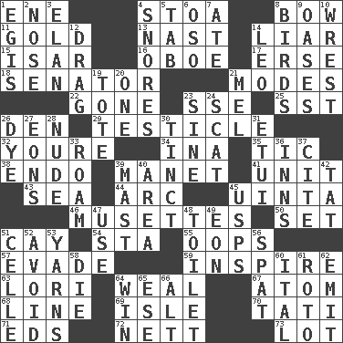 ACROSS 1. Compass dir. 4. Portico 8. Ribbon knot 11. Gilt 13. Political cartoonist Thomas 14. One who doesn't tell the truth 15. Austrian river, tributary to the Danube 16. Mitch Miller's instrument 17. Celtic language 18. Legislator 21. Methods 22. Went 23. Compass dir. 25. Fast jet (abbr.) 26. Lair 29. A testis 32. You are 34. _ tizzy (2 wds.) 35. Nervous spasm 38. Inside; within (prefix) 39. French painter Edouard 41. A single undivided whole 43. Ocean 44. Curve 45. National forest in Provo, Utah 46. French bagpipes 50. Arrange properly for use 51. Island 54. R.R. building 55. I made a mistake 57. Dodge 59. Stimulate to action 63. Australian parrot (variant) 64. Welt 67. Smallest unit of an element 68. Actor's bit 69. Capri or Wight 70. Jacques of French films 71. Begley and Asner 72. Remaining after all deductions 73. Car dealer's back yard DOWN 1. Armor plate that protects the chest 2. Olfactory organ 3. Style 4. Sounds asleep 5. Bar bill 6. Bear (Spanish) 7. Had dinner 8. Avian creatures 9. Fertile tracts in a desert 10. Obtain by seizing forcibly or violently 12. To be drawn or hauled along 14. Lion 19. Carry 20. Single 21. Cartoonist voice _ Blanc 23. Trig term 24. Jazz singing style 26. Color 27. Immeasurably long periods of time 28. Naked 30. A color or tint 31. Needle holder 33. Wander aimlessly 36. Taverns 37. Quote 39. Vertical spar for supporting sails 40. Type of rug 42. Make lace 45. United States Postal Service (abbr.) 47. Purpose 48. Rest room 49. A really long time 51. Cell (Danish) 52. Prevent from happening 53. Tall tales 56. Argument over a trivial matter 58. Pass on 60. Slanted text style (abbr.) 61. Printing process, for short 62. Give off 64. Acquire through effort 65. Compass dir. 66. Keyboard modifier key