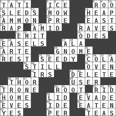 ACROSS 1. Jacques of French films 5. Frozen water 8. Friend of Pooh 11. Bobsleighs 13. Cut the grass 14. Pile 15. ID or VA city 16. Before (prefix) 17. Compass direction 18. Reproach for some lapse or misdeed 19. Among 21. All-night dance parties 22. Send forth 24. Lyric poems 25. Artist's stands 27. Insect wing 29. Johnson of "Laugh-In" 30. Dwarf 32. Take ten 33. Shabby and untidy 35. Root beer relative 39. Free of sound 41. Baking chamber 42. Big collection agency 43. Keyboard key 45. Son of Odin 48. One who uses or employs something 49. Heavy duty weighing machine 50. Carrot, for example 52. To free from 55. Residence 56. Hat (slang) 57. Dodge 59. Nights before holidays 60. Binary compound 61. Consumed 62. Consenting reply 63. For each 64. Afternoon social gatherings DOWN 1. Russian ruler of old 2. _ mater 3. Storms 4. Wedding promise 5. Body of Kaffir warriors 6. Drawstring 7. She-sheep 8. Rob, plunder, or pillage 9. Fertile tracts in a desert 10. Elects 12. Slow-paced one 14. Froth on beer 20. Mountains (abbr.) 21. Wander aimlessly 23. Confronts 25. Hearing organ 26. "We ___ not amused" (Victoria) 27. Also 28. Myrna of the movies 30. Set 31. Learning spot: Fr. 33. Title for a knight 34. Raised railways 36. Make much ado about nothing 37. Allow 38. One (Scot) 40. Hoop that covers a wheel 43. Superhero pair 44. First name in cosmetics 45. Collection of objects 46. Residences 47. Washington bills 49. Those people 50. Travel on or in a vehicle 51. River in Europe 53. The main thing one is thinking about 54. Lairs 56. Mouth edge 58. Large container