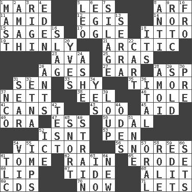 ACROSS 1. Female horse 5. French article 8. Sandy's bark 11. Among 12. The front part of a cuirass 14. Not either 15. Gurus 17. Stare 18. "Tell ____ the Marines!" 19. Without thickness 21. Northern region 23. Actress Gardner 25. Pate de foie ____ 26. Eons 27. Ewer handle 28. Cleo's killer 31. Elected rep. 33. Like a shrinking violet 35. The easternmost of the Lesser Sundas 37. Remaining after all deductions 38. Snakelike fish 40. Lacquered or enameled metalware 41. 2nd pers. sing. pres. of can (arch.) 43. "Barney Miller" actor Jack 45. Assist 46. Mouth or opening 47. Curvy letter 50. Freehold land 52. Is not 53. Animal enclosure 54. Winning man's name 56. Sounds asleep 61. Heavy book 62. Water falling in drops from the sky 65. Wear away 66. Mouth edge 67. Periodic rise and fall of the sea level 68. Came down and settled, as after flight 69. Music discs 70. At this time 71. Allows DOWN 1. Vertical spar for supporting sails 2. Wet nurse 3. Swiss mountan, "Queen of the Mountains" 4. Genesis locale 5. Lion 6. Oval reproductive body of a fowl 7. Fodder prepared in a silo 8. Against 9. College mil. group 10. From 13. Spanish missionary in California 16. Volcanic refuse 18. It is 20. Jacques Cousteau's middle name 22. Heavy open wagon 24. American tennis player Robert 26. Pismires 28. Mine, in Marseilles 29. Disposed of to a purchaser 30. Before (prefix) 31. Wither 32. Inactive volcano in Sicily 34. Consenting reply 36. Slanted text style (abbr.) 37. Non-commissioned officer (abbr.) 39. Central Nebraska county 42. Trial 44. Lyric poems 48. Derisive sound 49. Put through a sieve 51. Singer Murray 52. Frozen water 54. State of nonexistence 55. Naughty children 57. Taken by mouth 58. Hero or heavy, e.g. 59. Prepare for publication 60. Puts into a specified state 61. Affectionate concern, for short 63. Wedding promise 64. ___ Haven, CT