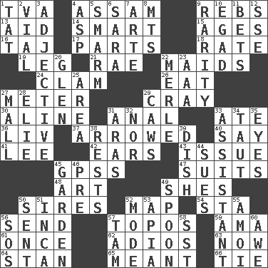 ACROSS 1. Federal power corp. 4. Indian state 9. Confederate soldiers (slang) 13. Help 14. Don Adams' spy role 15. Grows older 16. _ Mahal 17. Pieces 18. Assign a rank or rating to 19. Part of a journey 21. Actress Charlotte 22. Unmarried girls 24. Dollar (slang) 26. Consume 27. Distance measurement 29. Supercomputer manufacturer 30. Place in a line 31. Of or related to the anus 33. Had dinner 36. 54 in ancient Rome 37. Moved like an arrow 40. Declare 41. Area sheltered from the wind 42. Hearing organs 43. Come out of 45. Global Positioning Systems (abbr.) 47. Sets of matching outer garments 48. Tate display 49. "______ My Girl" (Turtles hit) 50. Founders of families 52. Atlas unit 54. R.R. building 56. Post 57. Literary convention 59. Nursemaid (var.) 61. At one time in the past 62. Goodbye (Sp.) 63. Immediately 64. Comedian Laurel of Laurel & Hardy 65. Intended 66. Standoff DOWN 1. Make lace 2. Small bottle 3. Descriptive word 4. Viper 5. Excessive but superficial compliments 6. "Two Mules for Sister ____" 7. Johnson of "Laugh-In" 8. Mountains (abbr.) 9. Noteworthy scarcity 10. Mild oath 11. Stakes 12. Compass dir. 20. Small, secluded valley 22. Haggard of country music 23. American Automobile Association (abbr.) 25. Length times width 27. Promenade 28. Writer Wiesel 29. Crow sounds 31. Caspian sea tributary 32. Or not 33. Helper 34. Tense 35. Snake ____ (dice throw) 38. Musical pauses 39. Food container 44. Institutes legal proceedings 45. Place where plants grow 46. Before (prefix) 49. Soup utensil 50. Emitted 51. South American Indian 52. Method 53. Capital of Western Samoa 55. Mine, in Marseilles 56. Distress signal 57. Scottish cap 58. Fast jet (abbr.) 60. Deep reverence