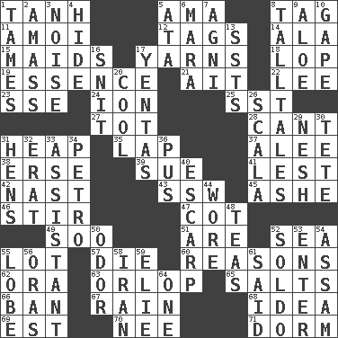 ACROSS 1. Hyperbolic tangent 5. Nanny (var.) 8. Label 11. Mine, in Marseilles 12. Labels 14. Chicken ___ king 15. Unmarried girls 17. Tall tales 18. Chop off 19. Gist 21. Small island 22. Area sheltered from the wind 23. Compass dir. 24. Electrically charged atom 25. Fast jet (abbr.) 27. Small child 28. Patter 31. Pile 35. Pet locale 37. Toward shelter 38. Celtic language 39. Take to court 41. For fear that 42. Political cartoonist Thomas 43. Compass dir. 45. American tennis player Robert 46. Tumult 47. Small bed 49. "Barney Miller" actor Jack 51. "We ___ not amused" (Victoria) 52. Ocean 55. Car dealer's back yard 57. Pass on 60. Thinks logically 62. Mouth or opening 63. Lowest deck of a ship 65. Table seasonings 66. Bar 67. Water falling in drops from the sky 68. The content of cognition 69. Eastern Standard Time (abbr.) 70. Born 71. Dormintory (informal) DOWN 1. Makes less strong or intense 2. Collect or gather 3. Annoying sound 4. Flintstone garb 5. "One Day ___ Time" 6. Hindu Mythology: god of death 7. Hindu god of fire 8. Baron Munchausen's specialties 9. _ vera 10. Yawn 13. Fast planes 16. In a ____ (agitated or irritated) 17. Gossips 20. Calm and collected 26. Any of the three canals of the cochlea 29. Soft 30. False hair 31. Coop moms 32. Part of Q.E.F. 33. Aide 34. Stone: prefix 36. Ichor 40. Fortification 44. Had on 48. Afternoon social gatherings 50. Scent 52. Twentieth part of a lira 53. Keyboard key 54. Indian state 55. Ear part 56. Mouths or openings 58. SW Asia republic 59. Writer Wiesel 61. Expressed in words 64. Single
