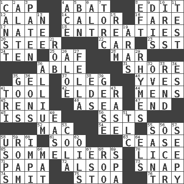ACROSS 1. Head covering 4. Blind as ____ 8. Prepare for publication 12. Actor Alda or Thicke 14. Bodily heat indicating an inflammation 16. Conductor's collection 17. Nathan's nickname 18. Pleas 20. Bull 22. Auto 23. Fast jet (abbr.) 24. Nine, plus one 25. Clumsy lout 28. Third mo. 30. Competent 31. Dinah or Pauly 35. Set 37. Cassini of fashion 40. Jacques Cousteau's middle name 41. Instrument 42. A person who is older than you are 44. Not women's 45. Painter Guido (1575-1642) 46. Toward the sea 47. Conclude 48. Come out of 50. Fast planes 52. Apple computer (short form) 54. Snakelike fish 55. Mayday 58. RI univ. 61. "Barney Miller" actor Jack 63. Desist 65. Wine waiters 70. Louse (plural) 71. Dad 72. Columnist Joseph or Stewart 73. Fastener 74. Stricken, poetically 75. Portico 76. Attempt to accomplish something DOWN 1. 2nd pers. sing. pres. of can (arch.) 2. Having winglike extensions 3. Eucharist need 4. Adept person 5. Bar 6. Keyboard modifier key 7. Torque (variant) 8. Newt 9. Raised platform 10. Angers 11. Trial 13. Born 15. 480, 500 or 516 sheets of paper 19. Caspian sea tributary 21. Director Reiner 26. Medicinal plant 27. Chap (slang) 29. Poems 30. Plant genus of onion and garlic 32. Baking chamber 33. Tear apart 34. Curvy letter 35. Leaves 36. Immeasurably long periods of time 38. Begley and Asner 39. Honkers 41. Three (prefix) 43. Raze (variant) 49. Relaxation 51. Affectionate concern, for short 53. Root beer relative 55. Inhabitant of Heaven 56. Witty Wilde 57. Oozy 58. United States Postal Service (abbr.) 59. Wander 60. Body of Kaffir warriors 62. Petroleums 64. Raised railways 66. Floor covering 67. Eastern Standard Time (abbr.) 68. Friend of Pooh 69. Health resort