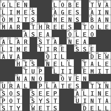 ACROSS 1. Small, secluded valley 5. Ear part 9. Federal power corp. 12. Citrus fruits 14. Matures 15. The 18th letter of the Arabic alphabet 16. Leaves out 17. Not women's 18. Forbid 19. Make imperfect 20. Trios 23. Lacquered or enameled metalware 24. Toward the sea 25. Margarine 27. Having or resembling wings 30. R.R. building 32. Teachers' org. 33. Welles in "The Third Man" 34. Become fatigued 36. Compass dir. 38. Actress Gardner 39. Lubricate 40. Morning condensation 43. Part of HMS, perhaps 46. 1994 drama film starring Jodie Foster 48. Falsehood 49. Uncastrated adult male sheep 51. Cards in a Roman deck? 52. Give off 53. Billionth: prefix 54. Baking chamber 56. Mountain range 58. Food holders 61. Metal container 64. Distress signal 65. Ooze 66. Place in a line 68. Cooking vessel 69. System (abbr.) 70. National forest in Provo, Utah 71. Filthy place 72. Soaks 73. Small valley DOWN 1. Take by theft 2. Pale green bean 3. Arab leader 4. Fish or hair follower 5. Unable to walk 6. Double curve, resembling the letter S 7. Gillaume's butler role 8. Double-curved letter 9. Off limits 10. Small bottle 11. Singer Murray 13. Fast planes 21. Command 22. Food allowance for one day 23. Afternoon social gatherings 24. "We ___ not amused" (Victoria) 26. French article 27. Wing 28. 54 in ancient Rome 29. Housemaid 31. Satellite of Uranus 35. American author Paul (1891-1958) 37. Dutch treat 41. Biblical high priest 42. Dripping 44. Slanted text style (abbr.) 45. Player for Phoenix 47. Not recorded 48. "___ Little Indians" 50. Wimpy's pal 53. Thoroughly unpleasant 55. Son of Isaac 56. United States Postal Service (abbr.) 57. Carrot, for example 59. For fear that 60. Flats, for short 61. Prong on a fork 62. International (abbr.) 63. Anneal 65. Compass dir. 67. Hat (slang)