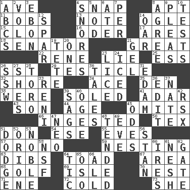 ACROSS 1. "___ Maria" 4. Fastener 8. Fitting 11. Moves up and down 13. Make mention of 14. Stare 15. Hoof sound 16. River in Europe 17. Ancient Greek god of war 18. Elected representative 21. Relatively large 22. French philosopher Descartes 23. Untruth 25. Curvy letter 26. Fast jet (abbr.) 29. One of the two male reproductive glands 32. Dinah or Pauly 34. Adept person 35. Lair 38. Past tense of be (plural) 39. Having a sole or soles 41. The sixth month of the Jewish calendar 43. Male child 44. Personal question 45. Leaves out 46. Swallowed 50. John Ritter's dad 51. Spanish title 54. Compass dir. 55. Nights before holidays 57. U. of Maine site 59. Inhabiting a nest 63. Rights 64. Frog relative 67. Length times width 68. _ course 69. Capri or Wight 70. Egg locale 71. Compass dir. 72. Chilled 73. A female animal or person DOWN 1. Lettered men learn these first 2. Short-tailed, large-bodied rat 3. Inky black, to poets 4. Sounds asleep 5. Dreamland 6. Had dinner 7. For each 8. Match 9. Entreaties 10. Trials 12. Practice fight 14. Rowing implement 19. False hair 20. Single 21. Set 23. Louse (plural) 24. On the rocks 26. Compass dir. 27. "______ My Girl" (Turtles hit) 28. "Corrida" creature 30. Falsehoods 31. Dutch treat 33. Painter Guido (1575-1642) 36. Prepare for publication 37. Nathan's nickname 39. Settles 40. Double curve, resembling the letter S 42. Acura sports coupe 45. Lyric poems 47. Modern: prefix 48. Looked after 49. First lady 51. Evade 52. Constellation of myth 53. Having high moral qualities 56. Comedian Laurel of Laurel & Hardy 58. Overdraft (abbr.) 60. Angers 61. Soft 62. Yard entry 64. Nervous spasm 65. Bear (Spanish) 66. 100%