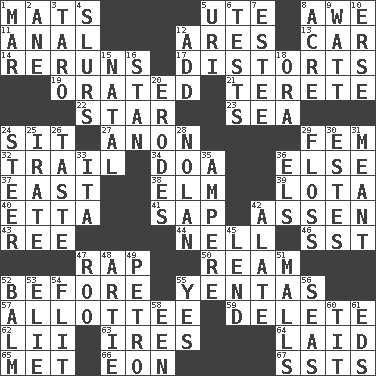 ACROSS 1. Floor coverings 5. Shoshoni 8. Deep reverence 11. Of or related to the anus 12. Ancient Greek god of war 13. 4-wheeled motor vehicle 14. Summer TV shows 17. What propaganda does 19. Spoke pompously 21. Cigar-shaped 22. Play the lead 23. Ocean 24. Be seated 27. Soon (poet.) 29. Opposite of masc. 32. Drop behind 34. ___ good deed 36. Otherwise 37. Compass direction 38. Shade tree 39. Globular water bottle used in Asia 40. Singer James 41. Plant excrement 42. NE Netherlands city 43. To separate or throw off 44. 1994 drama film starring Jodie Foster 46. Fast jet (abbr.) 47. Reproach for some lapse or misdeed 50. 480, 500 or 516 sheets of paper 52. Prior to 55. Gossips 57. One to whom something is allotted 59. Erase 62. Cards in a Roman deck? 63. Angers 64. Put down 65. Was introduced to 66. Period of immesurable duration 67. Fast planes DOWN 1. Make imperfect 2. One (Scot) 3. Edible starchy tuberous root 4. Disparaging remarks 5. RI univ. 6. Trials 7. First name in cosmetics 8. Measure of real estate 9. Electrical Unit 10. Celtic language 12. Say or write further 15. Relating to or accompanying birth 16. Comedian Laurel of Laurel & Hardy 18. Mouth or opening 20. Eats (away) 24. Navigate 25. Feeling or showing extreme anger 26. Clothes sense 28. Pitcher Ryan 29. Soft thread for cleaning between teeth 30. _____ Park, CO 31. Intended 33. Call ___ day 35. Electrical Unit 36. Raised railways 42. Having winglike extensions 45. Grant temporary use of 47. Friend of Pooh 48. Nick name for Arthur 49. Stone: prefix 51. Promenades 52. Lip ointment 53. Writer Wiesel 54. Sudden quick movement 55. Affirmative reply 56. Oceans 58. Car or cant ending 60. Teat (slang) 61. Begley and Asner
