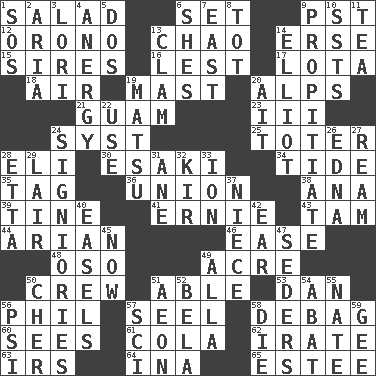 ACROSS 1. Vegetable dish 6. Arrange properly for use 9. Pacific Standard Time (abbr.) 12. U. of Maine site 13. US Secretary of Labor Elaine L. _ 14. Celtic language 15. Begets 16. For fear that 17. Globular water bottle used in Asia 18. Atmosphere 19. Vertical spar for supporting sails 20. High mountains 21. Island territory of the United States 23. One more than two 24. System (abbr.) 25. Carrier 28. Biblical high priest 30. 1973 Nobel Price Winner (Physics) Leo 34. Periodic rise and fall of the sea level 35. Label 36. The state of being joined or united 38. Santa ___, CA 39. Prong on a fork 41. Bert's buddy 43. Scottish cap 44. Believer in; advocate of (suffix) 46. Relaxation 48. Bear (Spanish) 49. Land measure 50. Group working together 51. Competent 53. Daniel's nick name 56. Silvers or Donahue 57. Sew up the eyelids of hawks and falcons 58. Debunk (Brit. slang) 60. Perceives with the eye 61. Root beer relative 62. Feeling or showing extreme anger 63. Big collection agency 64. _ tizzy (2 wds.) 65. First name in cosmetics DOWN 1. Distress signal 2. Roberta Peters solo 3. Australian parrot (variant) 4. Disorder of the immune system 5. Two (Sp.) 6. "______ My Girl" (Turtles hit) 7. Compass direction 8. Small child 9. Conciliate 10. Fast planes 11. Beverage made from leaves 13. Burrowing marine mollusk 14. American author Paul (1891-1958) 19. Taiwanese island in East China Sea 20. Small island 22. Purpose 24. Seigniories (variant) 26. Pulitzer Prize-winning author Ferber 27. 480, 500 or 516 sheets of paper 28. Singer James 29. Den 31. A saturated hydrocarbon 32. Apertif with cassis 33. Electrically charged atom 37. Sibling's daughter 40. Artist's stands 42. Ewer handle 45. Immediately 47. Spring feasts 49. Silent film actress Nazimova 50. "Mermaids" star 51. A really long time 52. Actor Lugosi 54. Blind as ____ 55. Nathan's nickname 56. Air pressure measure (abbr.) 57. _-fi 58. Pass on 59. Unit of force equal to gravity