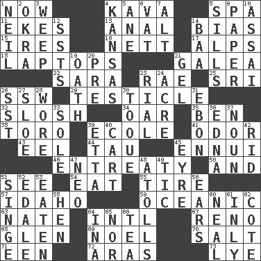 ACROSS 1. At this time 4. Polynesian shrub of the pepper family 8. Health resort 11. Makes supply last 13. Of or related to the anus 14. Prejudice 15. Angers 16. Remaining after all deductions 17. High mountains 18. Portable computers 21. An organ shaped like a helmet 22. "Two Mules for Sister ____" 23. Actress Charlotte 25. Indian title of respect (Mr.) 26. Compass dir. 29. A testis 32. Agitate, as a liquid 34. Boat paddle 35. Benjamin's nick name 38. "Corrida" creature 39. Learning spot: Fr. 41. Scent 43. Snakelike fish 44. The 19th letter of the Greek alphabet 45. World-weariness 46. Plea 50. Plus 51. Observe 54. Consume 55. Become fatigued 57. Potato state 59. Pertaining to the sea 63. Nathan's nickname 64. International (abbr.) 67. Former U.S. Attorney General Janet 68. Small, secluded valley 69. Christmas carol 70. Table seasoning 71. Car or cant ending 72. Caspian sea tributary 73. Sodium hydroxide DOWN 1. Famous astronaut Armstrong 2. Gumbo ingredient 3. Shed a tear 4. Sunflower state 5. A saturated hydrocarbon 6. Large container 7. Keyboard modifier key 8. Beverly of Met fame 9. Some stationery 10. Slender Brazilian palm 12. Fast planes 14. Sound made by sheep 19. Pledge 20. Before (prefix) 21. Set 23. Monetary unit of Yemen 24. 43,560 square feet 26. Fast jet (abbr.) 27. _ gin 28. Had on 30. Woman's close-fitting hat 31. Inky black, to poets 33. Flatfish 36. Pulitzer Prize-winning author Ferber 37. Part of speech 39. Singer James 40. Haul 42. To free from 45. Jane of fiction 47. Modern: prefix 48. Ringlike coral islands and reefs 49. Nervous spasm 51. Burn superficially 52. Peak District village in England 53. Consumed 56. Hearing organs 58. Layer 60. Actress Patricia 61. Inwardly 62. ____ d'Azur (French Riviera) 64. _ tizzy (2 wds.) 65. And not 66. Afternoon social gathering