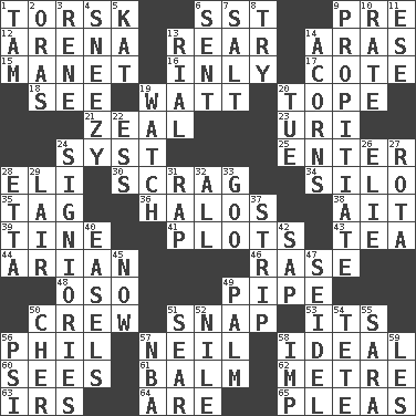 ACROSS 1. Cod relative 6. Fast jet (abbr.) 9. Before (prefix) 12. Sports stadium 13. Tail end 14. Ancient river in northeast Turkey 15. French painter Edouard 16. Inwardly 17. ____ d'Azur (French Riviera) 18. Perceive with the eye 19. Electrical Unit 20. Drink excessively 21. Ardor 23. RI univ. 24. System (abbr.) 25. Keyboard key 28. Connecticut Ivy Leaguer 30. Lean end of the neck 34. Grain storage tower 35. Label 36. Radiant circles of light 38. Small island 39. Prong on a fork 41. Schemes 43. Afternoon social gathering 44. Believer in; advocate of (suffix) 46. To erase 48. Bear (Spanish) 49. Corncob 50. Group working together 51. Fastener 53. It is 56. Silvers or Donahue 57. Famous astronaut Armstrong 58. Perfect 60. Perceives with the eye 61. Lip ointment 62. Distance measurement (Brit.) 63. Big collection agency 64. "We ___ not amused" (Victoria) 65. Entreaties DOWN 1. Scottish cap 2. Mouths or openings 3. French philosopher Descartes 4. Dwarf with a sinus problem 5. Krazy ___ of comics 6. Posted 7. Table seasoning 8. Attempt to accomplish something 9. Appease 10. Assign a rank or rating to 11. Compass dir. 13. Monetary unit of Yemen 14. Oak nuts 19. Observe 20. Third day of the wk. 22. Double-curved letter 24. Seigniories (variant) 26. Writer Wiesel 27. Roll call or roster of names 28. Singer James 29. Den 31. Reproach for some lapse or misdeed 32. Everything 33. Thick or sticky substance 37. Remove all contents or possession from 40. Artist's stands 42. Plant excrement 45. Immediately 47. A glass for beer 49. Inside of hand 50. "Mermaids" star 51. Singe 52. "Death on the ____" 54. Wig 55. "Two Mules for Sister ____" 56. Air pressure measure (abbr.) 57. Basketball assoc. 58. Naughty child 59. French article