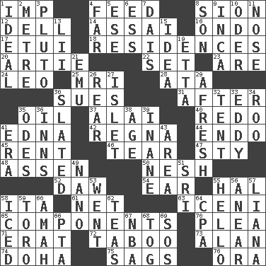 ACROSS 1. Naughty child 4. Nourish 8. The Jewish people; Israel 12. Small valley 14. Slender Brazilian palm 16. Southwest Nigerian state 17. Needle case 18. Dwellings 20. Nick name for Arthur 22. Arrange properly for use 23. "We ___ not amused" (Victoria) 24. Lion 25. Medical imaging device (abbr.) 28. _ moment's notice (2 wds.) 30. Institutes legal proceedings 31. Following 35. Lubricate 37. Jai ____ 40. Redecorate 41. Pulitzer Prize-winning author Ferber 42. Rain (Swedish) 44. Inside; within (prefix) 45. Monthly bill 46. Separate forcefully 47. Filthy place 48. NE Netherlands city 50. Soft 52. Obsolete 54. Hearing organ 55. Actor Linden 58. Call ___ day 61. Fish or hair follower 63. Ancient Celtic tribe of eastern Britain 65. Pieces 70. Entreaty 71. Part of Q.E.F. 72. Off limits 73. Actor Alda or Thicke 74. Capital of the state of Qatar 75. Settles 76. Mouth or opening DOWN 1. Perfect 2. Distance measurement (Brit.) 3. Mickey's pet 4. At a great distance 5. Compass dir. 6. Double-curved letter 7. Raised platform 8. Manchild 9. South American Indian 10. River in Europe 11. Olfactory organ 13. Cards in a Roman deck? 15. It may be bright or harebrained 19. Singer James 21. Australian flightless bird 26. Posterior 27. Small island 29. Anew 30. Scheduled 32. Portable shelter 33. Whirlpool 34. Friend of Pooh 35. Lyric poems 36. Restaurants 38. Mature 39. Silly 41. Epoch 43. Length times width 49. Billionth: prefix 51. _ Lanka 53. Left 55. Phone greeting 56. Approach 57. Woody, climbing, usually tropical plant 58. On the rocks 59. "Corrida" creature 60. Wet nurse 62. Afternoon social gatherings 64. Tax preparer (abbr.) 66. Parent Teacher Association (abbr.) 67. Basketball assoc. 68. Coat; cloak 69. Distress signal