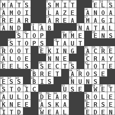ACROSS 1. Floor protectors 5. Stricken, poetically 9. Raised railways 12. Mine, in Marseilles 13. Goldbrick 14. Small Philippine buffalo 15. Stern 16. Length times width 17. Wise men 18. Also 19. Experiment locale 21. Relating to or accompanying birth 22. Halt 24. Madame (abbr.) 26. Followers of ems 27. Discontinues 28. Drawn tight 29. Carrot, for example 30. Supplementing with great effort 32. 43,560 square feet 36. _ vera 37. Compass dir. 38. Supercomputer manufacturer 39. Snakelike fish 40. Religious groups 42. Lug 43. Cy Young winner Saberhagen 44. Came up 46. Curvy letter 49. Altar cloth linen 50. Religious women 51. Unemotional 53. Purpose 54. Dripping 57. Old (Scot.) 58. Letter starter 61. Hero or heavy, e.g. 62. Leg joint 63. "____ silly question..." 64. Celtic language 65. It would 66. Welt 67. Paradise DOWN 1. Hindu Mythology: god of death 2. So be it 3. Inedible or poisonous agaric 4. Title for a knight 5. Thick slice 6. Make imperfect 7. Ending with capital 8. Beverage made from leaves 9. Maternal 10. Utah city north of Ogden 11. Moves on water 14. Nanny (var.) 19. Trim (branches) 20. Domed church section 21. Fish or hair follower 23. Lugs 24. French painter Edouard 25. Large cup 27. Flatfish 28. A color or tint 29. Actress Charlotte 31. Leg joints 32. Gambison 33. What you're doing now 34. Pace 35. Sight organ 40. _ Lanka 41. Without 43. English channel? 45. Regret 46. 1973 Nobel Price Winner (Physics) Leo 47. Check the growth or development of 48. Having a sole or soles 52. Binary compound 53. Mountain range 55. Otherwise 56. Adolescent 58. Fool 59. Compass dir. 60. Alias (abbr.) 61. Portuguese money of account (variant)