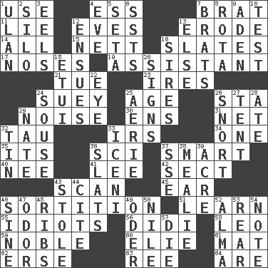 ACROSS 1. Purpose 4. Curvy letter 7. Naughty child 11. Untruth 12. Nights before holidays 13. Wear away 14. 100% 15. Remaining after all deductions 16. Chalkboards 17. Olfactory organs 19. Aide 21. Third day of the wk. 23. Angers 24. Chop _ 25. Grow older 26. R.R. building 29. Annoying sound 30. Followers of ems 31. Fish or hair follower 32. The 19th letter of the Greek alphabet 33. Big collection agency 34. Single 35. It is 36. _-fi 37. Don Adams' spy role 40. Born 41. Area sheltered from the wind 42. Religious group 43. Examine minutely or intensely 45. Hearing organ 46. Casting lots 51. Acquire or gain knowledge or skills 55. Foolish or stupid persons 56. "You Light Up My Life" star Conn 58. Lion 59. Having high moral qualities 60. Writer Wiesel 61. Floor covering 62. Celtic language 63. To separate or throw off 64. "We ___ not amused" (Victoria) DOWN 1. ____ Bator 2. Grain storage tower 3. Snakelike fish 4. Night before a holiday 5. Stalk of a moss capsule 6. Fast planes 7. Naughty children 8. Roll call or roster of names 9. Arabian gulf 10. Trial 12. Takes place subsequently 13. Otherwise 16. Founders of families 18. Needle case 20. Signals 22. Sight organ 24. Boozer 25. Nest on high 26. Derisive sound 27. Portable shelter 28. Had dinner 29. Nathan's nickname 32. Metal container 33. Ancient Celtic tribe of eastern Britain 36. Narrow boards 37. Compass dir. 38. Ear of corn 39. Land measure 43. Took without asking 44. Quote 46. Trig term 47. Scent 48. Chest bones 49. River in Europe 50. The longest river in the world 52. _ mater 53. Posterior 54. Short letter 57. Expire