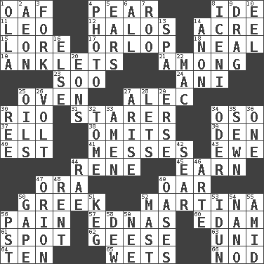 ACROSS 1. Clumsy lout 4. Lightbulb-shaped fruit 8. Binary compound 11. Lion 12. Radiant circles of light 14. 1/640 square mile 15. Old wives' tales, e.g. 17. Lowest deck of a ship 18. Actress Patricia 19. Short socks 21. Amid 23. "Barney Miller" actor Jack 24. Cuckoo 25. Baking chamber 27. Actor Baldwin 30. River (Sp.) 31. A viewer who gazes fixedly 34. Bear (Spanish) 37. Pipe bend 38. Leaves out 39. Lair 40. Eastern Standard Time (abbr.) 41. Makes clutter 43. She-sheep 44. French philosopher Descartes 45. Merit 47. Mouth or opening 49. Rowing implement 50. Hellenic 52. Chrissie's court nemesis 56. Ache 57. Ferber et al. 60. Dutch treat 61. Blemish 62. Honkers 63. Corn or form start 64. Nine, plus one 65. Soaks 66. Dreamland DOWN 1. Water jar 2. Period of immesurable duration 3. Tined utensil 4. Picture 5. Hearing organs 6. 100% 7. Friend of Pooh 8. Ancient Celtic tribe of eastern Britain 9. To trail on the ground 10. Snakelike fish 13. Health resort 14. Soon (poet.) 16. Otherwise 20. Immeasurably long periods of time 22. Big _ 25. Petroleums 26. Electrical Unit 27. Ascend 28. Allows 29. Celtic language 30. To separate or throw off 32. Heavy book 33. So be it 34. River in Europe 35. Stitched 36. Single 42. Shrivel 44. Actress Charlotte 46. Johnson of "Laugh-In" 47. Constellation of myth 48. Monthly bill 49. Fertile tracts in a desert 50. Yawn 51. Cask 52. Vertical spar for supporting sails 53. Goddess of spring and wife of Bragi 54. Billionth: prefix 55. Among 56. Pacific Standard Time (abbr.) 58. Morning condensation 59. Born