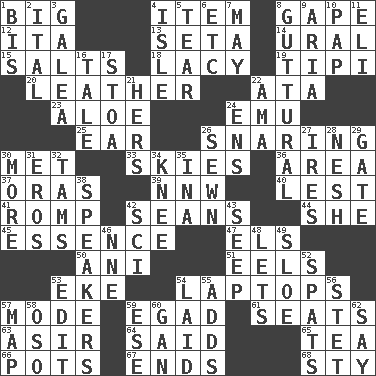 ACROSS 1. Massive 4. A distinct part 8. Stare wonderingly 12. Call ___ day 13. Stalk of a moss capsule 14. Mountain range 15. Table seasonings 18. Made of lace 19. Native american tent (variation) 20. Cordwainer's material 22. _ moment's notice (2 wds.) 23. _ vera 24. Australian flightless bird 25. Hearing organ 26. Catching in a trap 30. Was introduced to 33. Atmospheres 36. Type of rug 37. Mouths or openings 39. Compass dir. 40. For fear that 41. Play 42. Actors Connery and Penn 44. A female animal or person 45. Substance 47. Raised railways 50. Black tropical American cuckoo 51. Snakelike fish 53. Supplement with great effort 54. Portable computers 57. Method 59. Mild oath 61. Theater features 63. SW Saudi Arabia district 64. Expressed in words 65. Afternoon social gathering 66. Plant holders 67. Conclusions 68. Filthy place DOWN 1. Twice 2. Slanted text style (abbr.) 3. An organ shaped like a helmet 4. Capri or Wight 5. Lacerate 6. And so on (abbr.) 7. Can I? 8. From the throat 9. Roberta Peters solo 10. Infant food 11. Biblical high priest 16. Story 17. Portico 21. Possessive pronoun 22. Nanny (var.) 24. Followers of ems 26. Stitched 27. Angers 28. Soft 29. Yard entry 30. Greater amount 31. Greek god of love 32. Scottish caps 34. Leg joint 35. _ tizzy (2 wds.) 38. Orators 42. _-fi 43. Ooze 46. Compass dir. 48. Allows 49. _ gin 52. Arguments over trivial matters 53. Prepare for publication 54. Put down 55. Sums up 56. Proofreading order 57. Atlas unit 58. Bear (Spanish) 59. Compass dir. 60. Separate the seeds from cotton 62. Declare