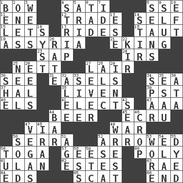 ACROSS 1. Ribbon knot 4. Suttee (variant) 8. Compass dir. 11. Compass dir. 12. Swap 14. Automatic 15. Allows 17. Amusement-park features 18. Strained 19. Nineveh was its capital 21. Supplementing with great effort 23. Plant excrement 24. Big collection agency 25. Remaining after all deductions 27. Den 30. Perceive with the eye 31. Artist's stands 34. Ocean 37. Actor Linden 38. Make or become more lively 39. Pacific Standard Time (abbr.) 40. Raised railways 41. Opts 43. Auto club (abbr.) 44. Fermented drink made from hops 45. Shade of tan 47. By way of 49. Armed conflict 50. Father Junipero _ 52. Moved like an arrow 56. Ancient Roman robe 57. Honkers 60. Much (prefix) 61. Uhlan (variant) 62. _____ Park, CO 63. Actress Charlotte 64. Begley and Asner 65. Scram, to a cat 66. Conclude DOWN 1. Actor Lugosi 2. Washington bills 3. Moistens 4. Remove all contents or possession from 5. Operatic vocal solo 6. Bit 7. Binary compound 8. Actors Connery and Penn 9. A hard, heavy blow 10. Lizard (obsolete) 13. Compass dir. 14. Disorderly outburst 16. System (abbr.) 20. Assign a rank or rating to 22. Apertif with cassis 25. Be tempered by heat 26. Snakelike fish 27. Prying instrument 28. Actor Baldwin 29. Is not 30. A female animal or person 32. Toward shelter 33. Filth; sediment 34. Practice fight 35. He sold his birthright 36. _ moment's notice (2 wds.) 42. Singe 44. Tavern 46. Riding implement 47. Viva Las _ 48. SW Asia republic 49. Obtain by seizing forcibly or violently 50. Exchanged or delivered for money 51. Ripen 52. At sea 53. Had on 54. Enthusiasm 55. Colored 56. Third day of the wk. 58. Curvy letter 59. And so on (abbr.)
