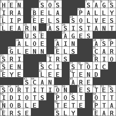 ACROSS 1. Layer 4. Distress signal 7. Droops 11. Lyricist Gershwin 12. Actor Lugosi 13. Friendly 14. Mouth edge 15. Snakelike fish 16. Finds the solution 17. Memorize 19. Aide 21. Purpose 23. Ripens 24. _ vera 25. The 18th letter of the Arabic alphabet 26. Viper 29. American astronaut and politician John 30. Raised railways 31. 4-wheeled motor vehicle 32. Indian title of respect (Mr.) 33. Big collection agency 34. River (Sp.) 35. Elected rep. 36. _-fi 37. Unemotional 40. Sight organ 41. Area sheltered from the wind 42. Watch over 43. Examine hastily 45. "We ___ not amused" (Victoria) 46. Determination 51. _____ Park, CO 55. Foolish or stupid persons 56. Mail 58. Baseball player Mel 59. Having high moral qualities 60. False hair 61. Parent Teacher Association (abbr.) 62. Celtic language 63. Cunning 64. Ewer handle DOWN 1. Land elevation 2. 4th largest of the Great Lakes 3. California wine valley 4. Perceive with the eye 5. Water jar 6. Backtalk 7. Table seasonings 8. Inventor's middle name 9. Small, secluded valley 10. System (abbr.) 12. Gillaume's butler role 13. Airs 16. Signals 18. Governing power 20. Travel by water 22. Car or cant ending 24. Place in a line 25. Nest on high 26. Sour-tasting 27. Ketch in the Levant 28. Adept person 29. Jennifer or Joel 32. Compass dir. 33. Ancient Celtic tribe of eastern Britain 36. Narrow boards 37. R.R. building 38. Cigar-shaped 39. Washington bills 43. Fur scarf 44. Quote 46. Trig term 47. Aroma 48. Teases 49. Chooses 50. Christmas carol 52. Drink excessively 53. Singer James 54. Play the lead 57. Filthy place