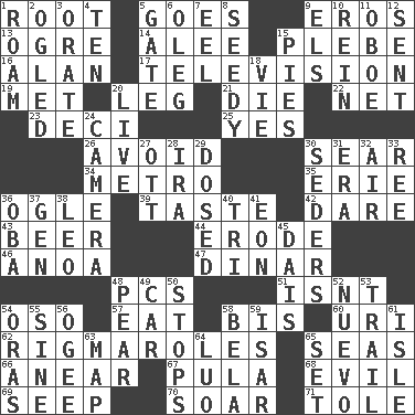 ACROSS 1. Carrot, for example 5. Leaves 9. Greek god of love 13. Legendary monster 14. Toward shelter 15. Military trainee 16. ____ Jay Lerner 17. Household entertainment appliance 19. Was introduced to 20. Part of a journey 21. Expire 22. Fish or hair follower 23. Tenth: prefix 25. It is so 26. Prevent from happening 30. Burn superficially 34. Paris' subway 35. One of the Great Lakes 36. Stare 39. Clothes sense 42. Have the gumption 43. Fermented drink made from hops 44. Eat (away) 46. Small Philippine buffalo 47. Middle Eastern gold or silver currency 48. Personal Computers (abbr.) 51. Is not 54. Bear (Spanish) 57. Consume 58. Altar cloth linen 60. RI univ. 62. Frustrating wastes of time 65. Oceans 66. Approach 67. Monetary unit of Botswana 68. Morally bad or wrong 69. Ooze 70. Fly high 71. Lacquered or enameled metalware DOWN 1. Wander aimlessly 2. Stared at amorously 3. Speak pompously 4. "___ Little Indians" 5. Yard entry 6. Cassini of fashion 7. Snakelike fish 8. Sleazy 9. Raised railways 10. It's straight from the horse's mouth 11. Mitch Miller's instrument 12. Posted 15. Sliced desserts 18. Compete 20. Not recorded 24. Device for capturing images 27. Baseball player Mel 28. Retirement account (abbr.) 29. Administered medicine 30. Spring feasts 31. Epoch 32. Atmosphere 33. To sift 36. Chief or king in Benin or Nigeria 37. Commissioned military rank (abbr.) 38. Lion 40. Three (prefix) 41. A really long time 45. Raised platform 48. Lightbulb-shaped fruit 49. Auto 50. Halts 52. New (sp.) 53. Drop behind 54. Mouths or openings 55. Trig term 56. Double curve, resembling the letter S 58. Actor Lugosi 59. Austrian river, tributary to the Danube 61. Capri or Wight 63. Atlas unit 64. Nilotic language 65. Arrange properly for use