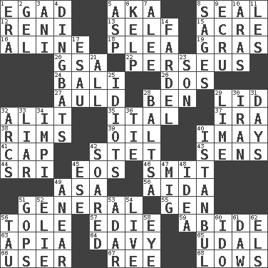 ACROSS 1. Mild oath 5. Alias (abbr.) 8. Lick closed 12. Painter Guido (1575-1642) 13. Automatic 15. Measure of real estate 16. Place in a line 18. Entreaty 19. Pate de foie ____ 20. Girls' org. (abbr.) 22. Son of Zeus who helped slay Medusa 24. Indonesian resort city 26. Two (Sp.) 27. Old (Scot.) 28. Benjamin's nick name 29. Flaplike covering 32. Set down 35. Slanted text style (abbr.) 37. Lyricist Gershwin 38. Basketball hoops 39. Petroleum 40. "If ____ say so..." 41. Head covering 42. Proofreading order 43. Elected reps. 44. _ Lanka 45. Greek goddess of the dawn 46. Stricken, poetically 49. White ___ sheet 50. Opera by Verdi 51. Commissioned military rank 55. Commissioned military rank (abbr.) 56. Lacquered or enameled metalware 57. Singer Brickell 59. Remain 63. Capital of Western Samoa 64. _ Jones' Locker 65. Hereditary estate 66. One who makes use of a thing 67. To riddle 68. Coldest temperatures DOWN 1. Period 2. Set 3. Cuckoo 4. Empty-headed or silly people 5. Cleo's killer 6. Seaweed 7. Toward shelter 8. Gurus 9. Shade of tan 10. Ancient river in northeast Turkey 11. French article 14. Bundle 17. Son of Isaac 21. Everything 23. Boy, to dad 25. Foolish or stupid persons 28. Greek mezzo-soprano Agnes 29. Welles in "The Third Man" 30. SW Asia republic 31. 24-hour periods 32. Arches 33. One who doesn't tell the truth 34. Body of Kaffir warriors 36. Standoff 40. Byzantium, centuries later 42. Flew 45. Compass dir. 47. Russian fighter aircraft 48. It may be bright or harebrained 49. Approach 51. Republicans 52. Writer Wiesel 53. The sixth month of the Jewish calendar 54. Moving, as bait 56. The 19th letter of the Greek alphabet 58. Sight organ 60. Wedding promise 61. Fool 62. Raised railways