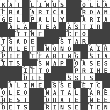 ACROSS 1. Krazy ___ of comics 4. "_ and Lucy" (Charlie Brown theme song) 9. Spanish pot 13. Period 14. N. Chile seaport 15. Wander 16. Set 17. Friendly 18. Operatic vocal solo 19. According to 21. Afternoon social gathering 22. Being in motion 24. Prong on a fork 26. Corporate head (abbr.) 27. Sadhe (variant) 29. Play the lead 30. An arm off of a larger body of water 31. Words to Nanette 33. Atmosphere 36. Sliced dessert 37. Separating forcefully 40. R.R. building 41. ___ a Wonderful Life 42. Fastener 43. Fertile tracts in a desert 45. "Tell ____ the Marines!" 47. A-one 48. Pass on 49. Fast planes 50. Place in a line 52. Compass dir. 54. And so on (abbr.) 56. Butter sub 57. Relating to or accompanying birth 59. "We ___ not amused" (Victoria) 61. Repose 62. Speak pompously 63. Born 64. Wagers 65. Remove soap 66. Nine, plus one DOWN 1. Cask 2. Length times width 3. Baron Munchausen's specialties 4. Pet locale 5. Feeling or showing extreme anger 6. Mediterranean tributary 7. Southern CA. univ. 8. Declare 9. Speaker 10. Australian parrot (variant) 11. Den 12. Wet nurse (var.) 20. Assistant 22. 13-14th century defensive garment 23. Ocean 25. Remaining after all deductions 27. Native american tent (variation) 28. In a ____ (agitated or irritated) 29. Sever or remove by pinching or nipping 31. Billionth: prefix 32. Mouth or opening 33. Aide 34. A distinct part 35. To erase 38. First name in cosmetics 39. Republicans 44. Johnson of "Laugh-In" 45. Foolish or stupid persons 46. Metal container 49. Theater features 50. Toward shelter 51. For fear that 52. Indian skirt 53. Comedian Laurel of Laurel & Hardy 55. Algonquian 56. Globe 57. And not 58. Area sheltered from the wind 60. Car or cant ending