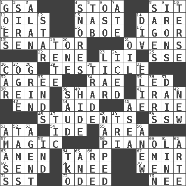 ACROSS 1. Girls' org. (abbr.) 4. Portico 8. Be seated 11. Petroleums 13. Political cartoonist Thomas 14. Have the gumption 15. Part of Q.E.F. 16. Mitch Miller's instrument 17. Composer Stravinsky 18. Elected representative 21. Baking chambers 22. French philosopher Descartes 23. Cards in a Roman deck? 25. Compass dir. 26. Gear tooth 29. A testis 32. Match 34. Actress Charlotte 35. Directed 38. It's straight from the horse's mouth 39. Pottery fragment 41. SW Asia republic 43. Conclusion 44. Assist 45. Nest on high 46. SAT takers 50. Compass dir. 51. "One Day ___ Time" 54. Binary compound 55. Type of rug 57. Mysterious quality of enchantment 59. Player piano 63. So be it 64. Canvas cover 67. Arab leader 68. Post 69. Leg joint 70. Gone 71. Fast jet (abbr.) 72. Wrote a lyric poem 73. Born DOWN 1. Travels 2. Father 3. Actor Alda or Thicke 4. Sounds asleep 5. Keyboard key 6. Bear (Spanish) 7. Had dinner 8. Gurus 9. Metal shackles 10. Laconic 12. Play the lead 14. HTML Container Element 19. False hair 20. Single 21. Lubricate 23. One who doesn't tell the truth 24. On the rocks 26. Automobile 27. Double curve, resembling the letter S 28. Amused look 30. Buy and sell 31. Writer Wiesel 33. Conclusions 36. Blunders 37. Raised platform 39. Saudi Arabian king (1953-1964) 40. Flintstone garb 42. ___ Haven, CT 45. At sea 47. Nervous spasm 48. Slept 49. Three (prefix) 51. Collect or gather 52. Softens 53. Representative 56. Afresh 58. Indiana (abbr.) 60. Presage 61. Actor's bit 62. Johnson of "Laugh-In" 64. Ring climax 65. Plus 66. To separate or throw off